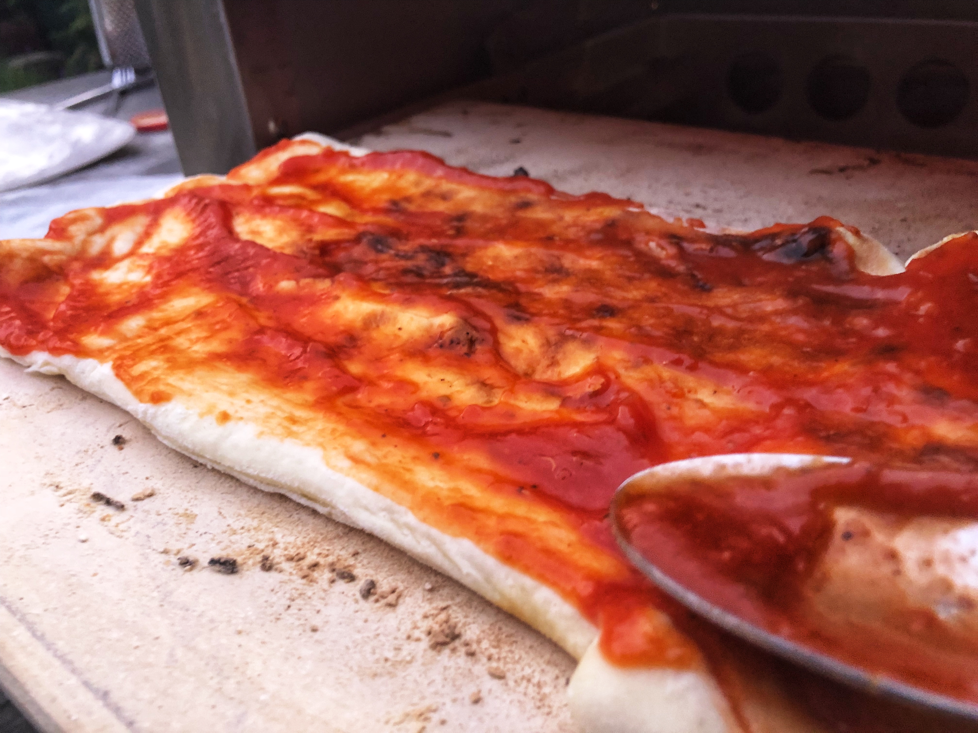 Die letzten Male ist mir doch irgendwie die Tomatensauce angebrannt... also habe ich diesmal erst den Teig für 2-3 minuten gebacken. Und dann erst die Sauce drauf gestrichen :-)