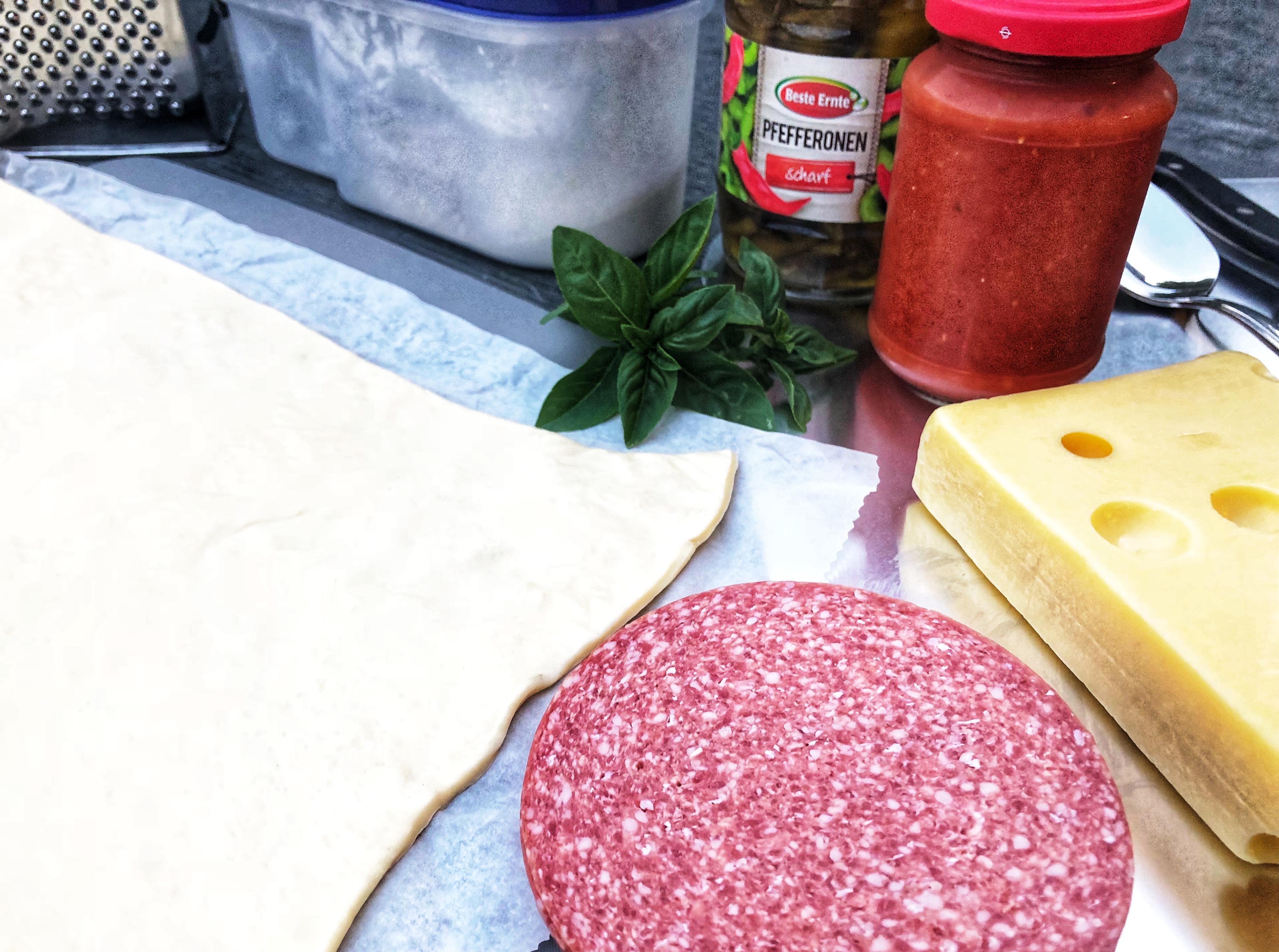Wie ihr erkennen könnt bereite ich die Pizza ganz klassisch mit Salami und 🔥 Peperoni zu :-)