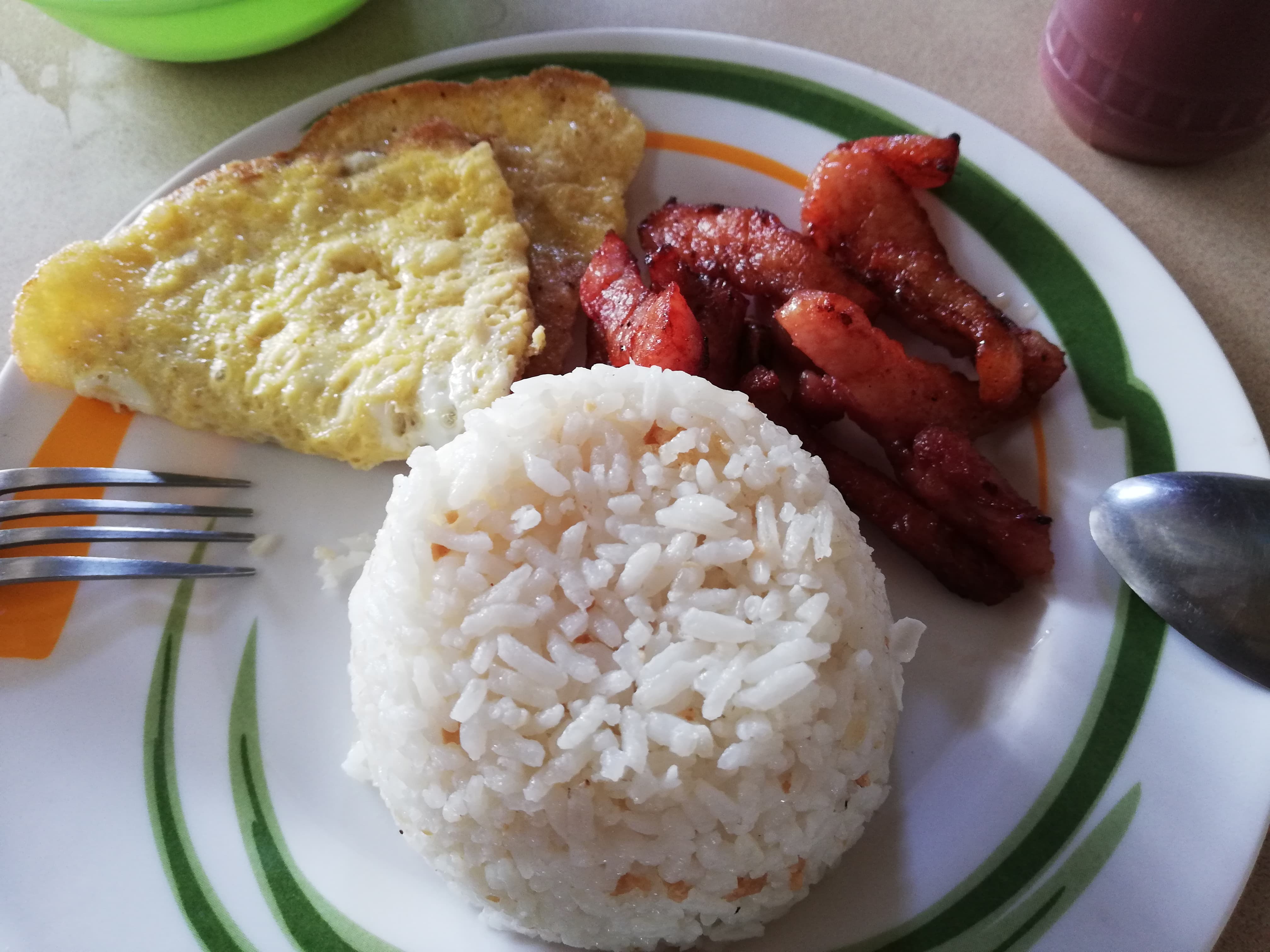 Tosilog is short for Tocino (sweet pork), Sinangag (Fried rice) and Itlog (egg). For only $1.33 this is a full pack meal to get you going thru the day.