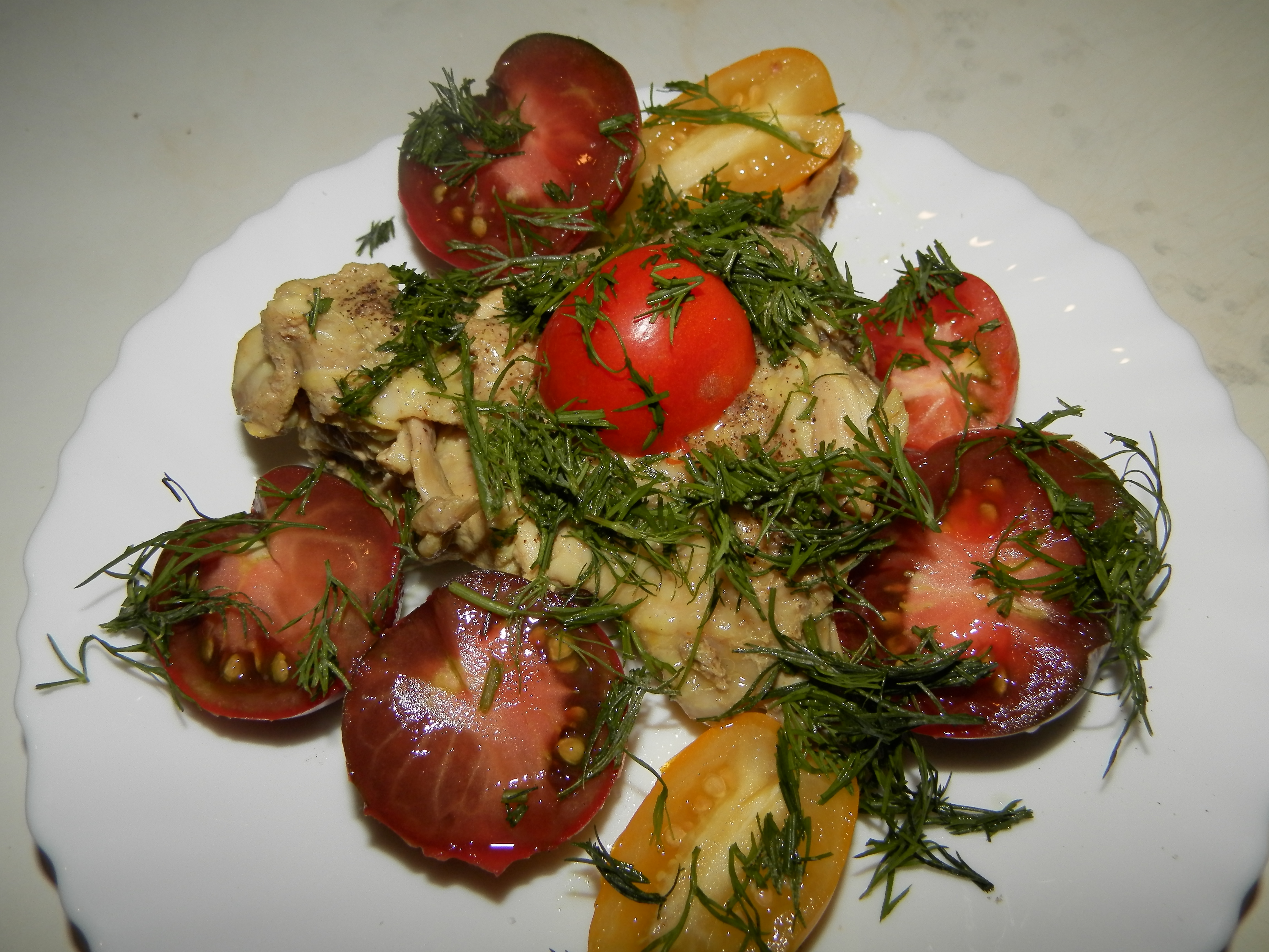 For dinner I cooked a boiled chicken with fresh tomatoes and dill. This is a healthy food. Products should be consumed without salt.
