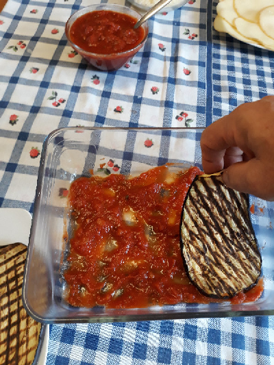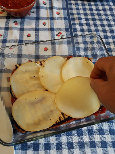 Next thing to do is just to put down the ingredients by layers, starting with the tomato sauce (so the cheese does not stick to the bottom), followed by the slices of eggplant, the slices of smoked provolone and a plentiful sprinkle of Parmesan, and so on.