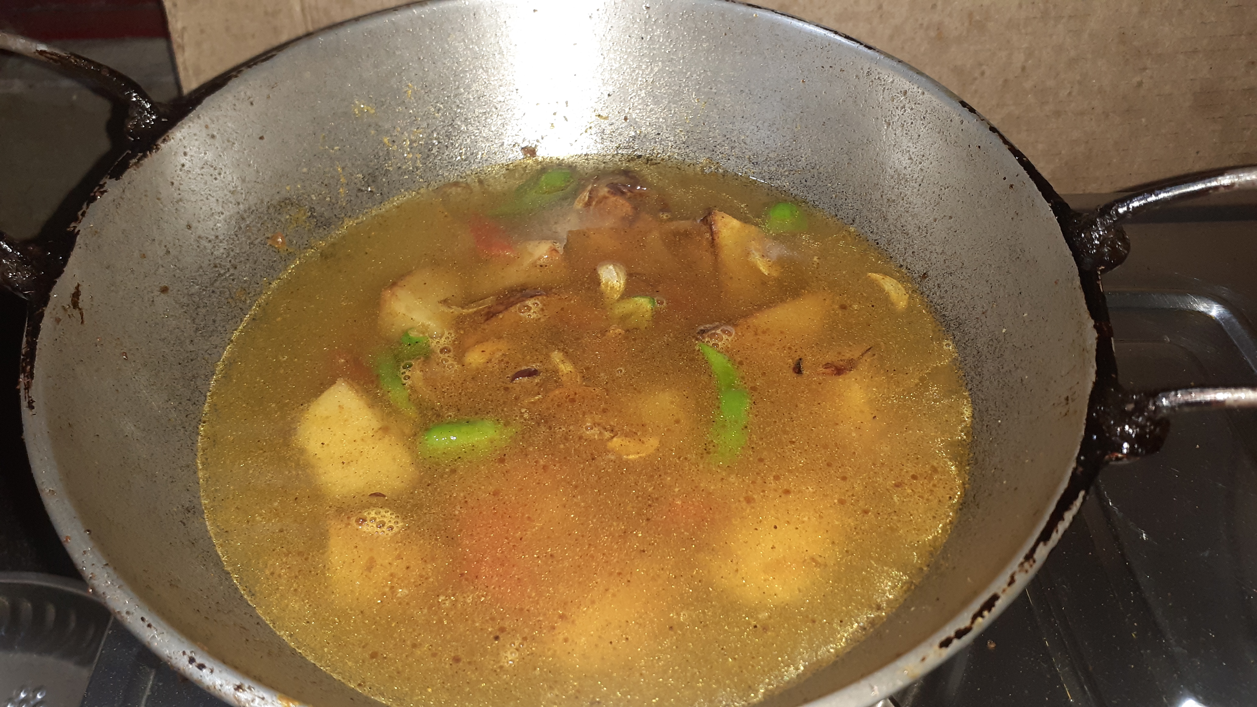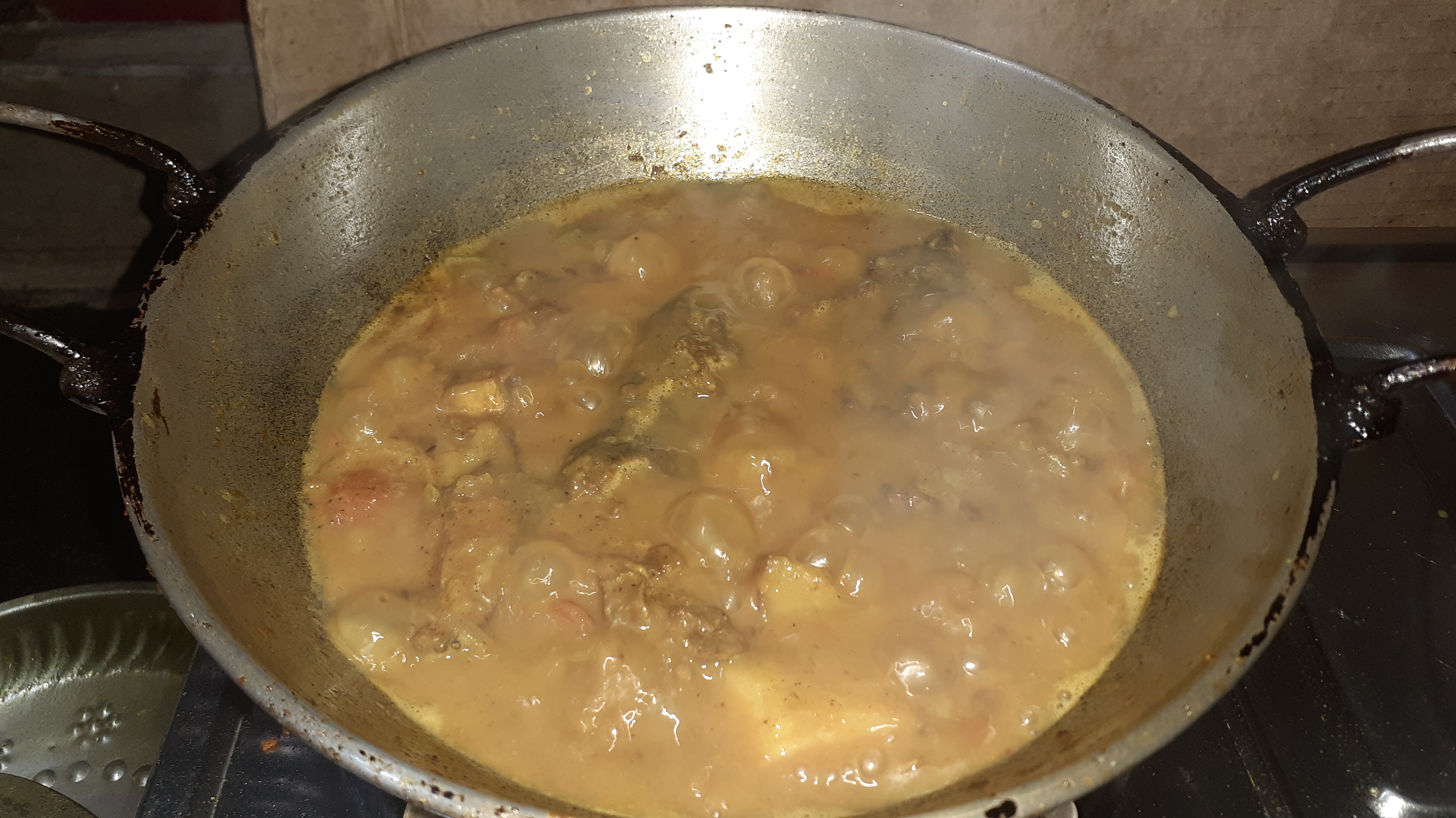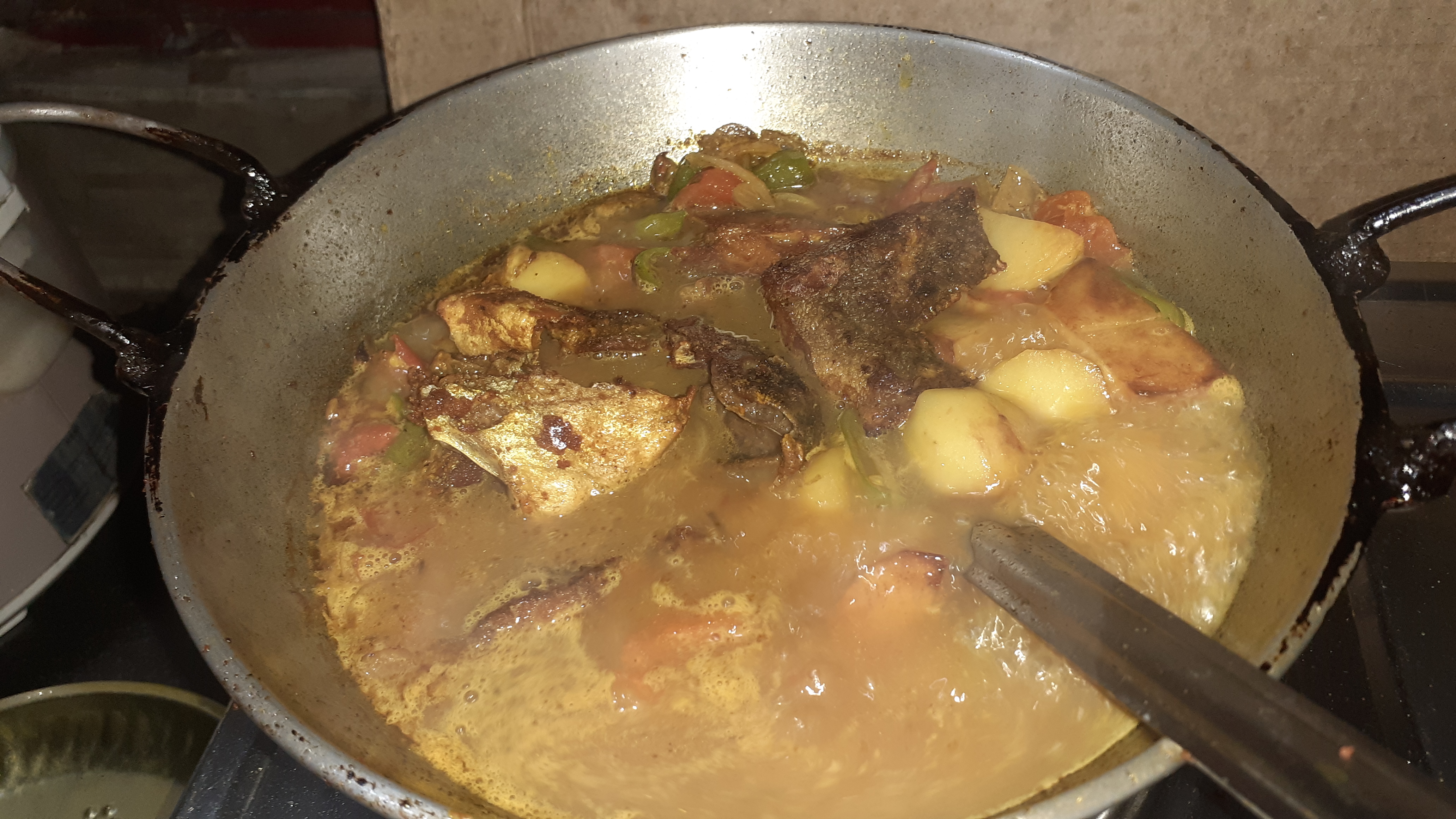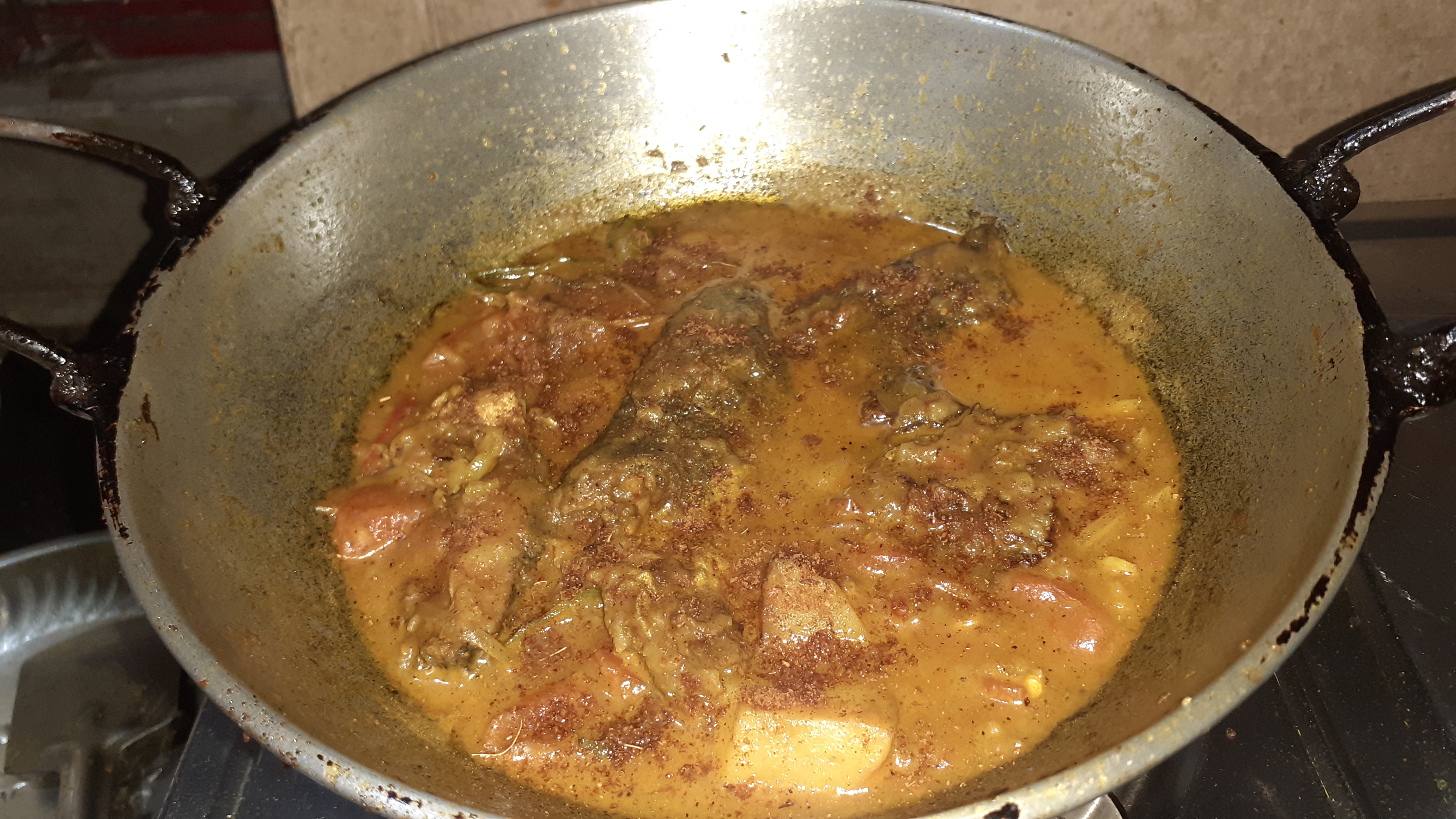 মেশানোর পরে তাতে জল দিয়ে দিয়েছি। জল ফোটা শুরু করলে ভাজা মাছের পিচগুলো দিয়ে দিলাম। মাছের তরকারিটা ভালোমতো হওয়ার জন্য ১২ মিনিট অপেক্ষা করলাম। ১২ মিনিট পরে চুলা অফ করে দিলাম এবং ভাজা মশলার গুঁড়ো ছড়িয়ে দিলাম তরকারির উপর দিয়ে।
