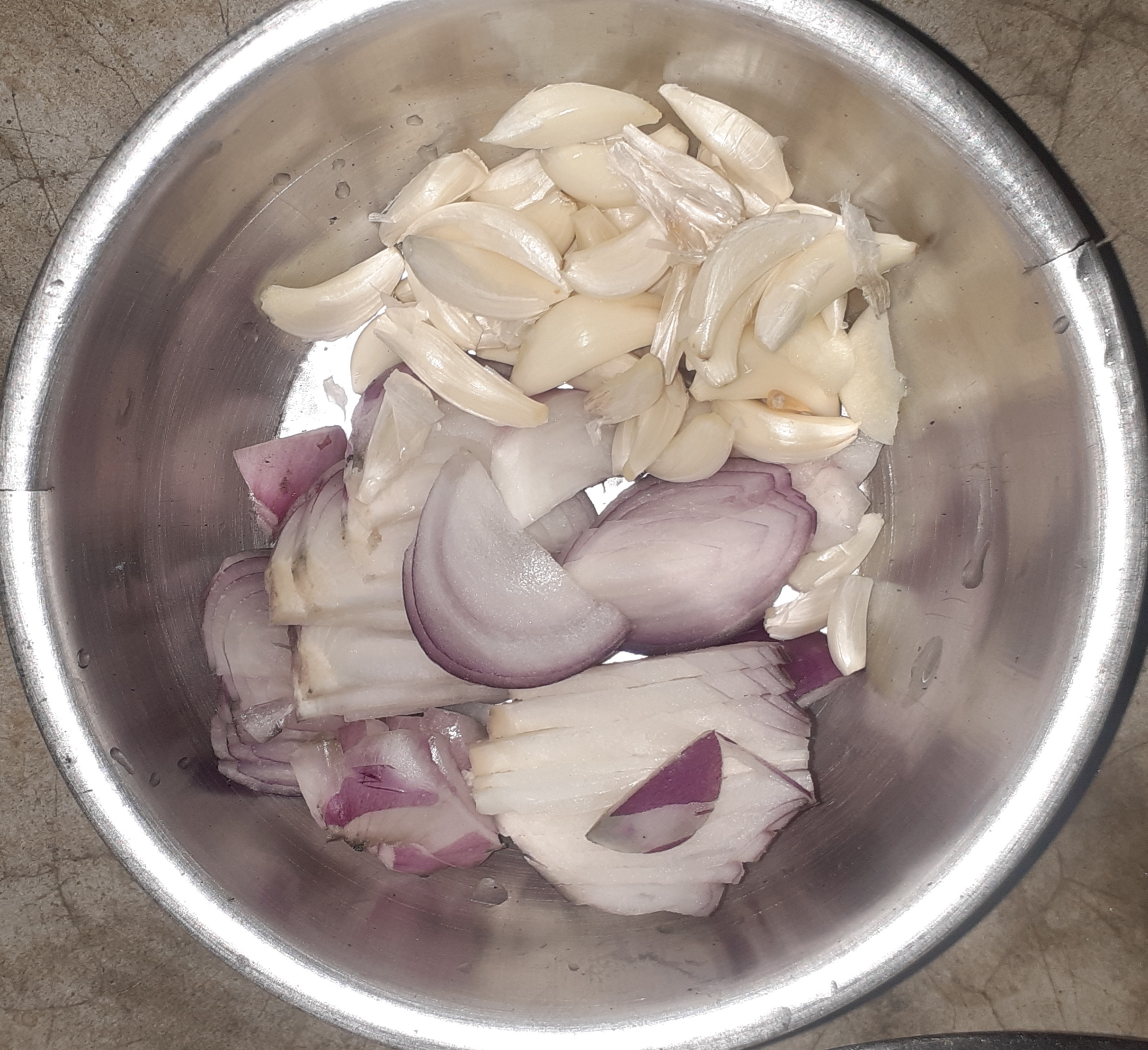 পেয়াঁজ ও রসুনের খোসা ছালিয়ে নিয়েছি। পেয়াঁজ কেটে বাটিতে রেখেছি।