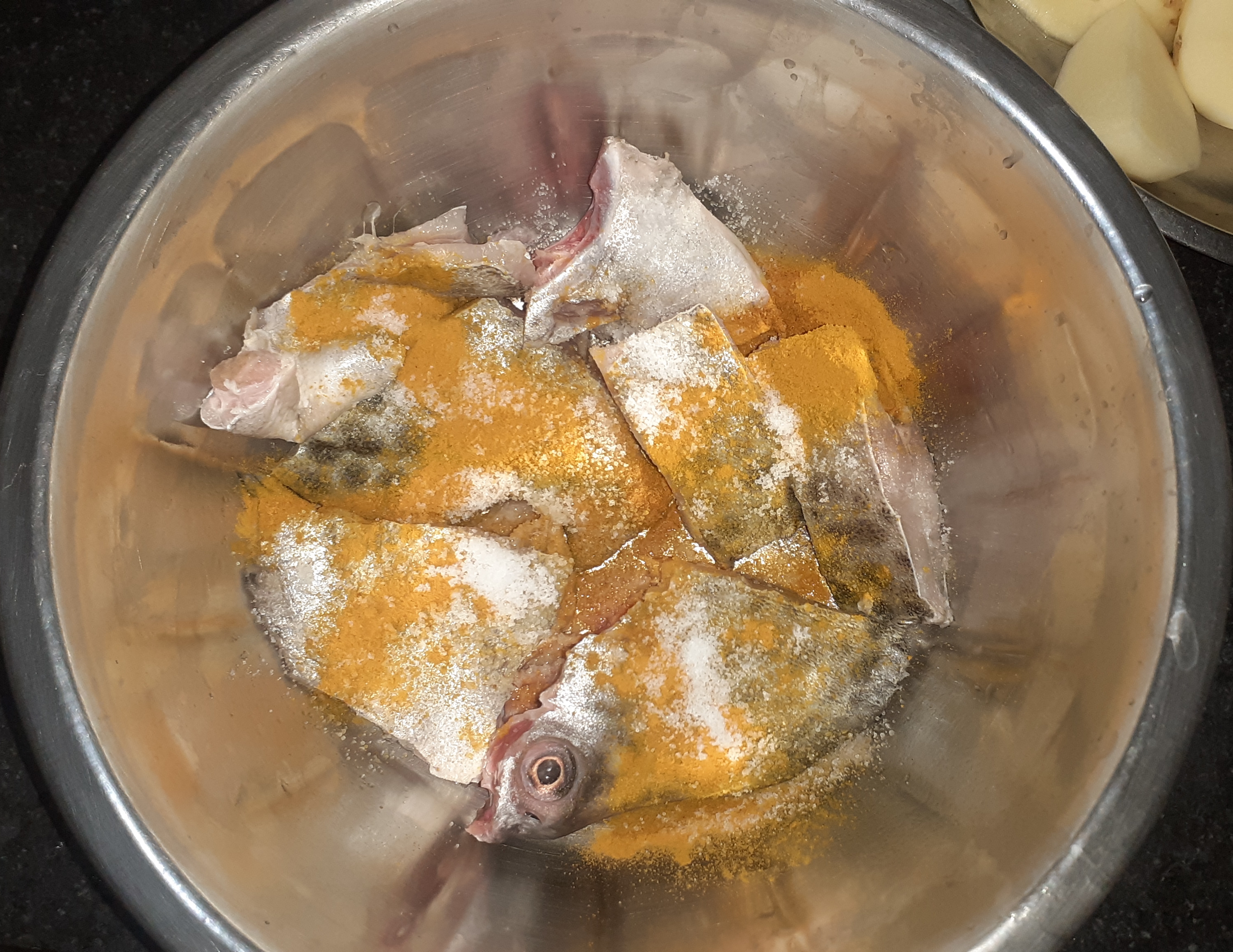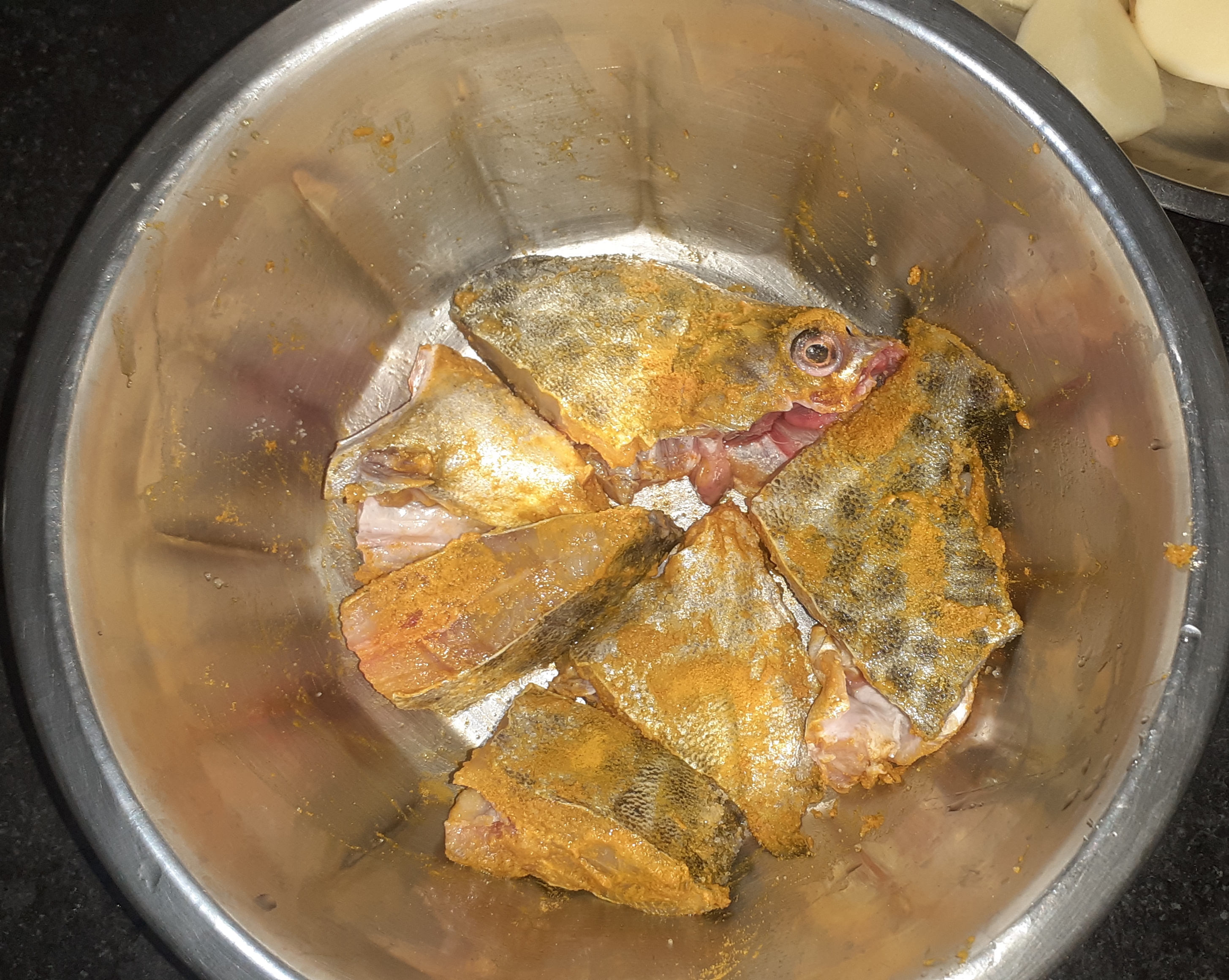 মাছের পিচগুলোতে লবন ও হলুদ ভালো করে মাখিয়ে নিয়েছি।