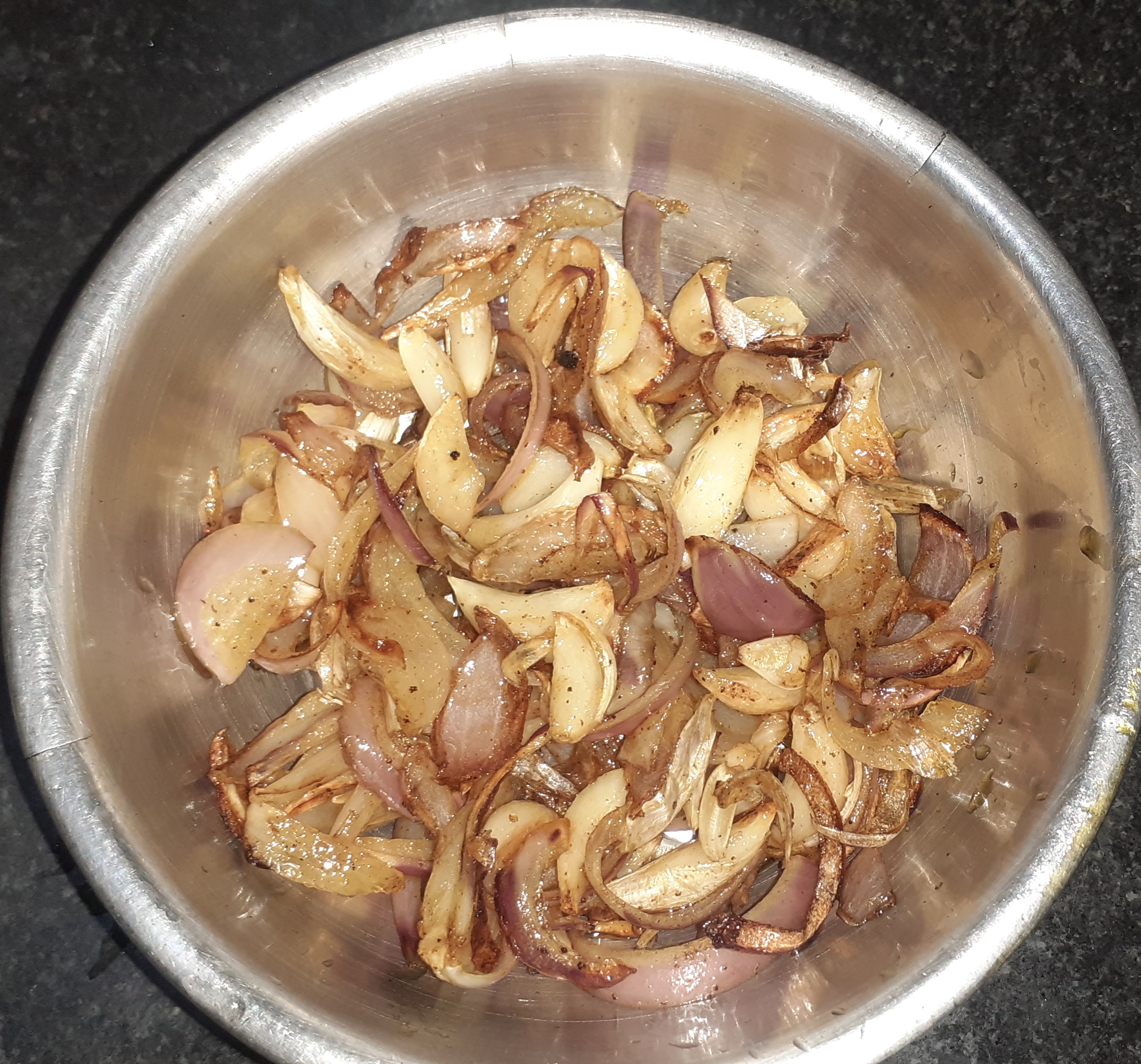 পেয়াঁজ ও রসুন লাল মতো করে ভেজে বাটিতে তুলে নিয়েছি।