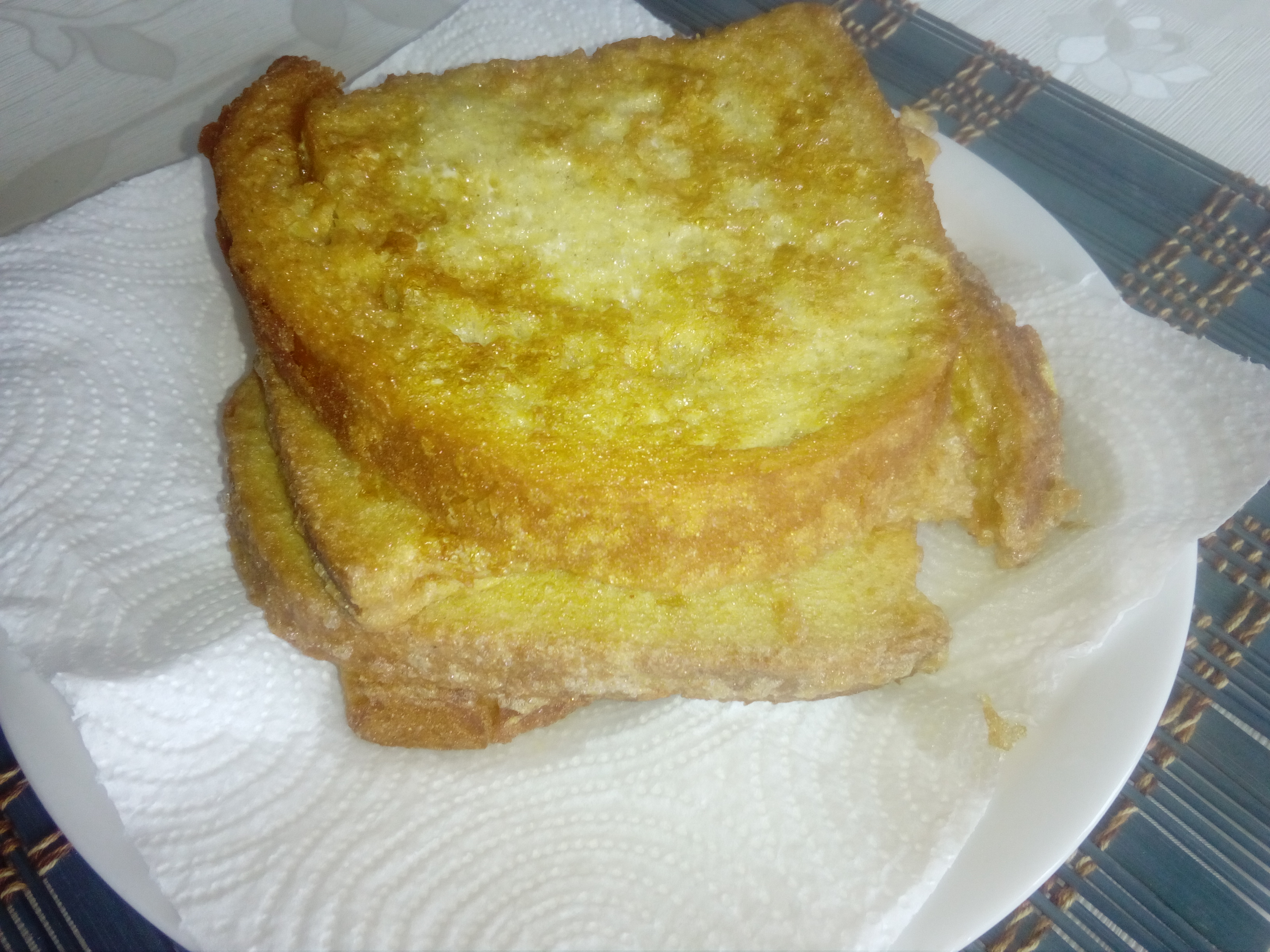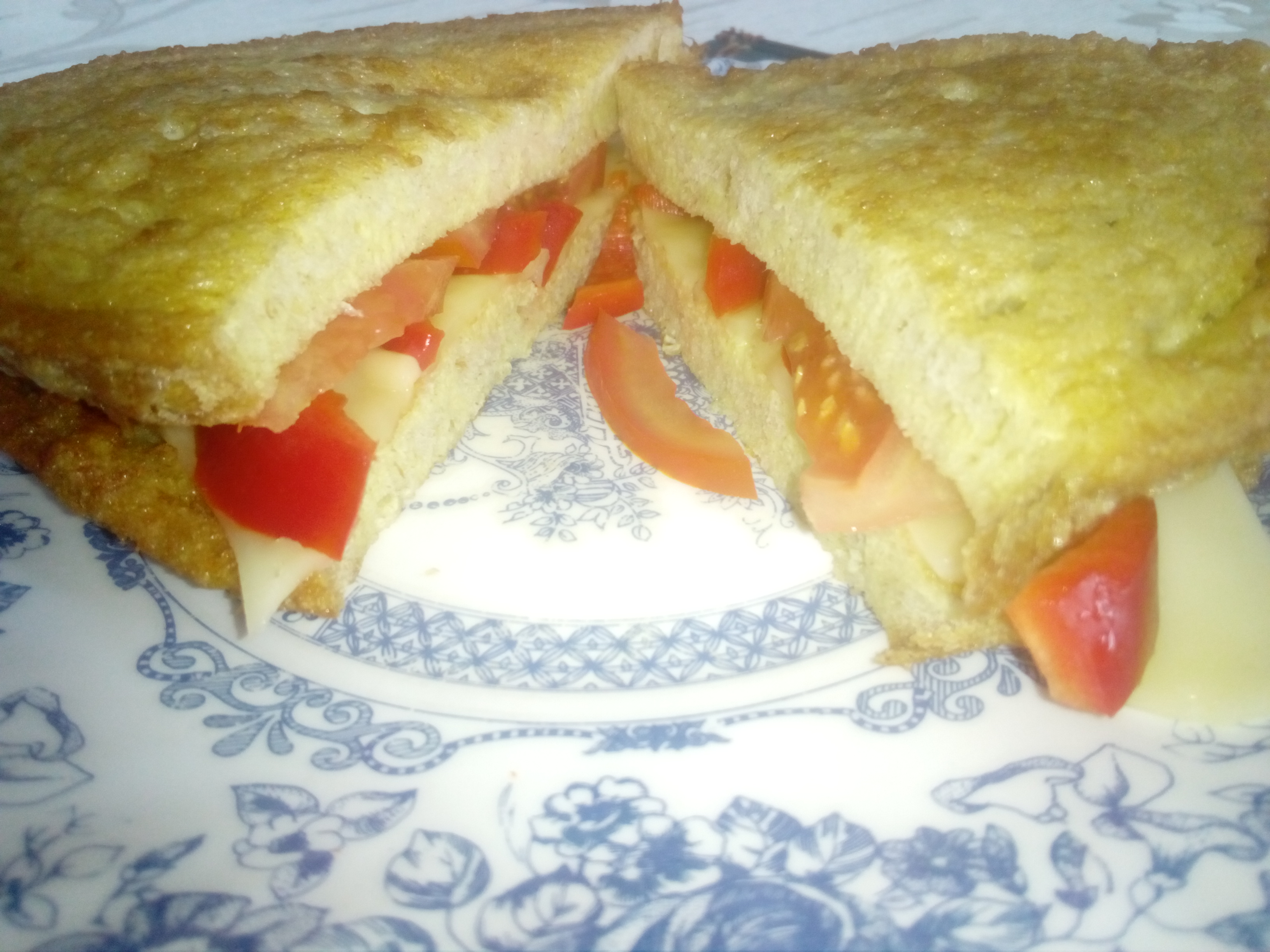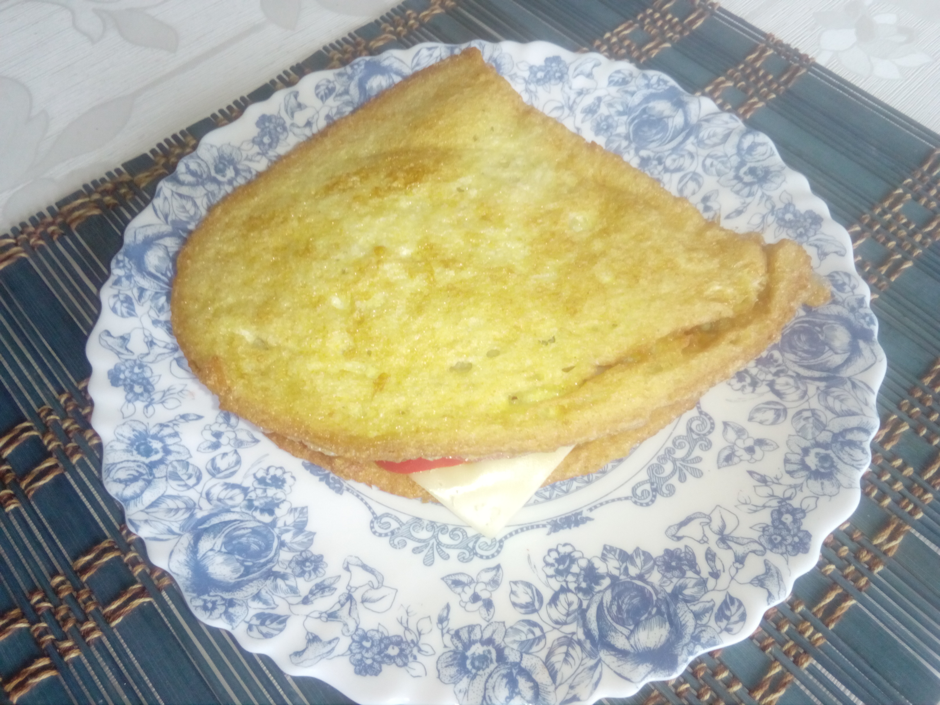 First add three eggs in a bowl add a little salt and mix until they become homogeneous take the slices of bread and put in the bowl and then add to the pan with oil burned to medium heat after frying the bread in the egg, add a slice of cheese, pepper, tomatoes and add a slice of bread in the egg, and so I cook a quick and tasty breakfast.