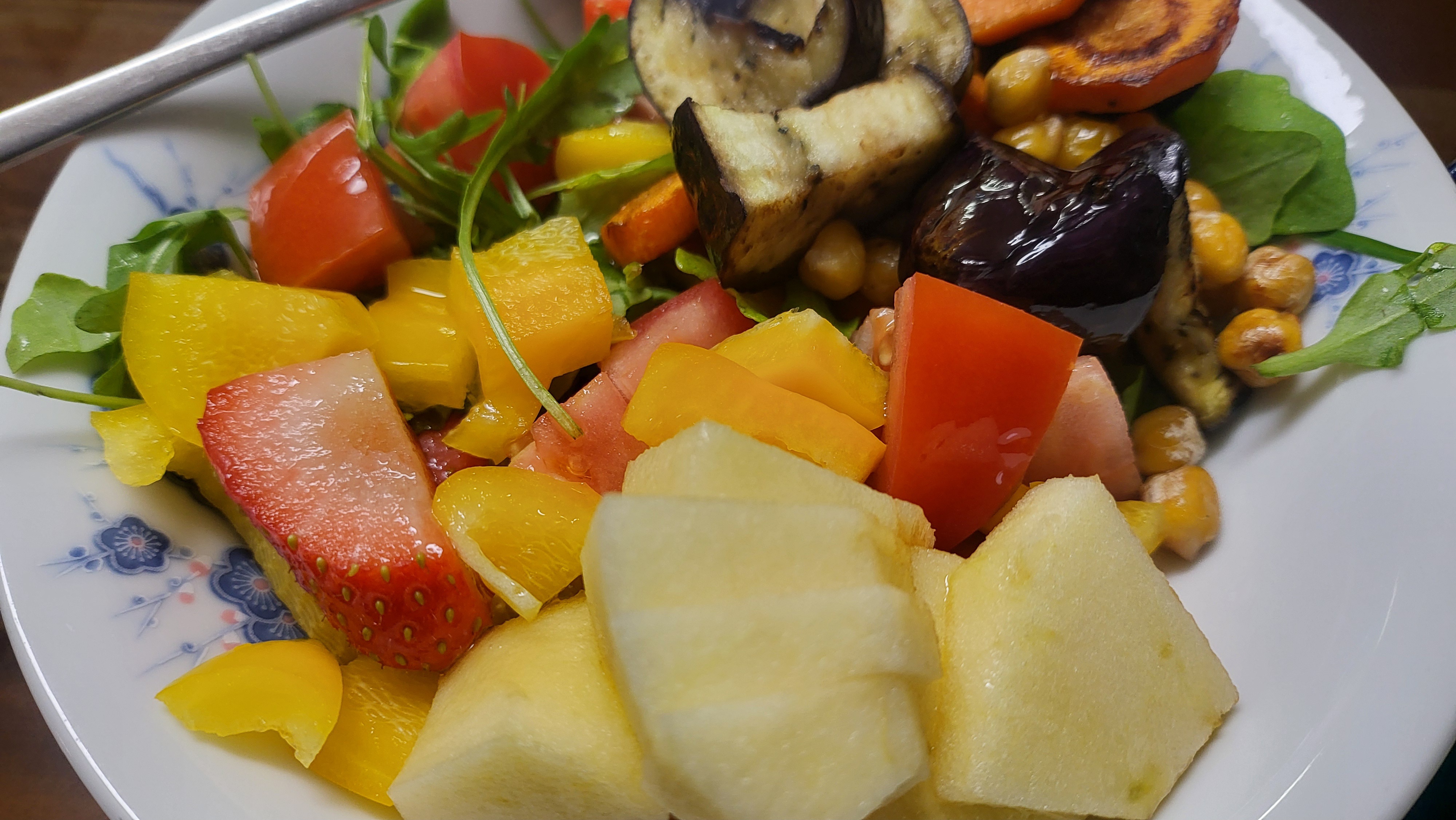 오늘의 샐러드 #66grace.eum (77)in #food • 2 days ago ➊ 토마토, 양배추 등 각종 야채와 과일을 깨끗이 씻고 한입 크기로 잘라서 샐러드 만들고, ➋ 오늘도 호박크림스프, 그리고 맛있는 커피. 🥖 ☕️ #krsuccess