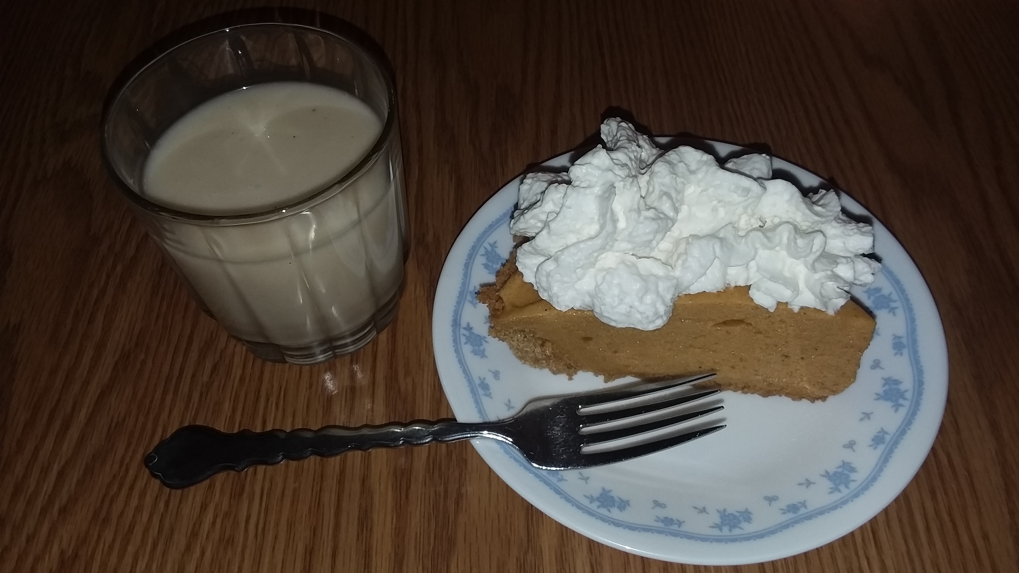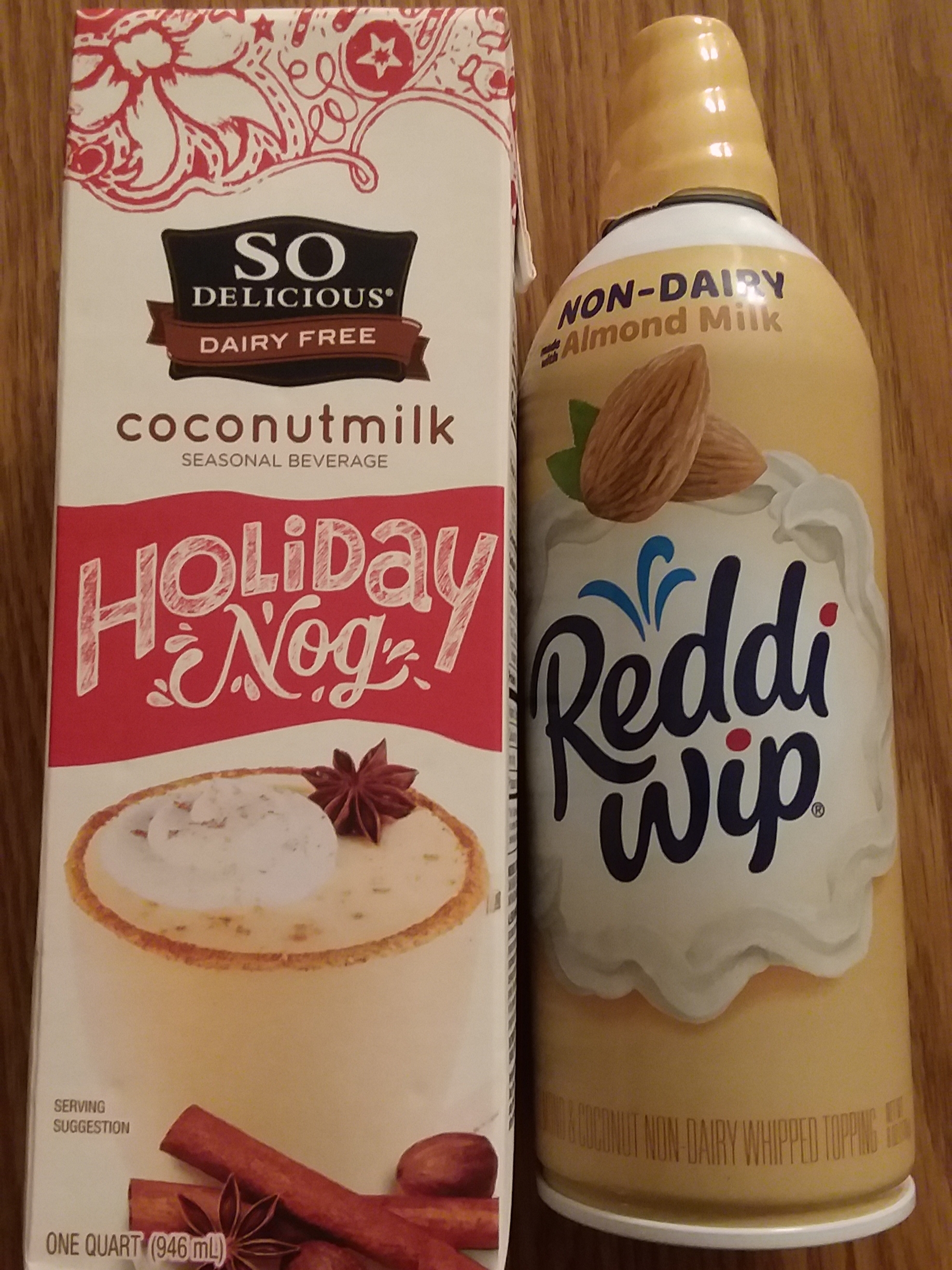 The Mother Thing* made a pumpkin chiffon pie for a special Christmas dessert, and I decided to "gild the lily" by adding a liberal dose of dairy-free whipped cream substitute as I ate a slice for a midnight snack. Because I feel like showing complete disregard for healthy caloric intake, I also washed it down with a glass of dairy-free egg nog alternative. Yay carbohydrates!