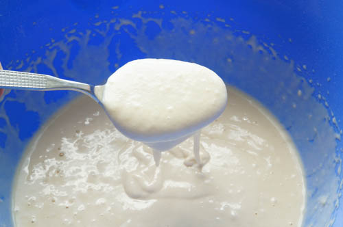 You should get a fairly thick dough (if you turn the spoon, it will fall more lumps than drain from it). In fact, after the first time you will immediately know the correct consistency of the test. Heat the pan over medium heat WITHOUT OIL and spread future pancakes with a spoon.