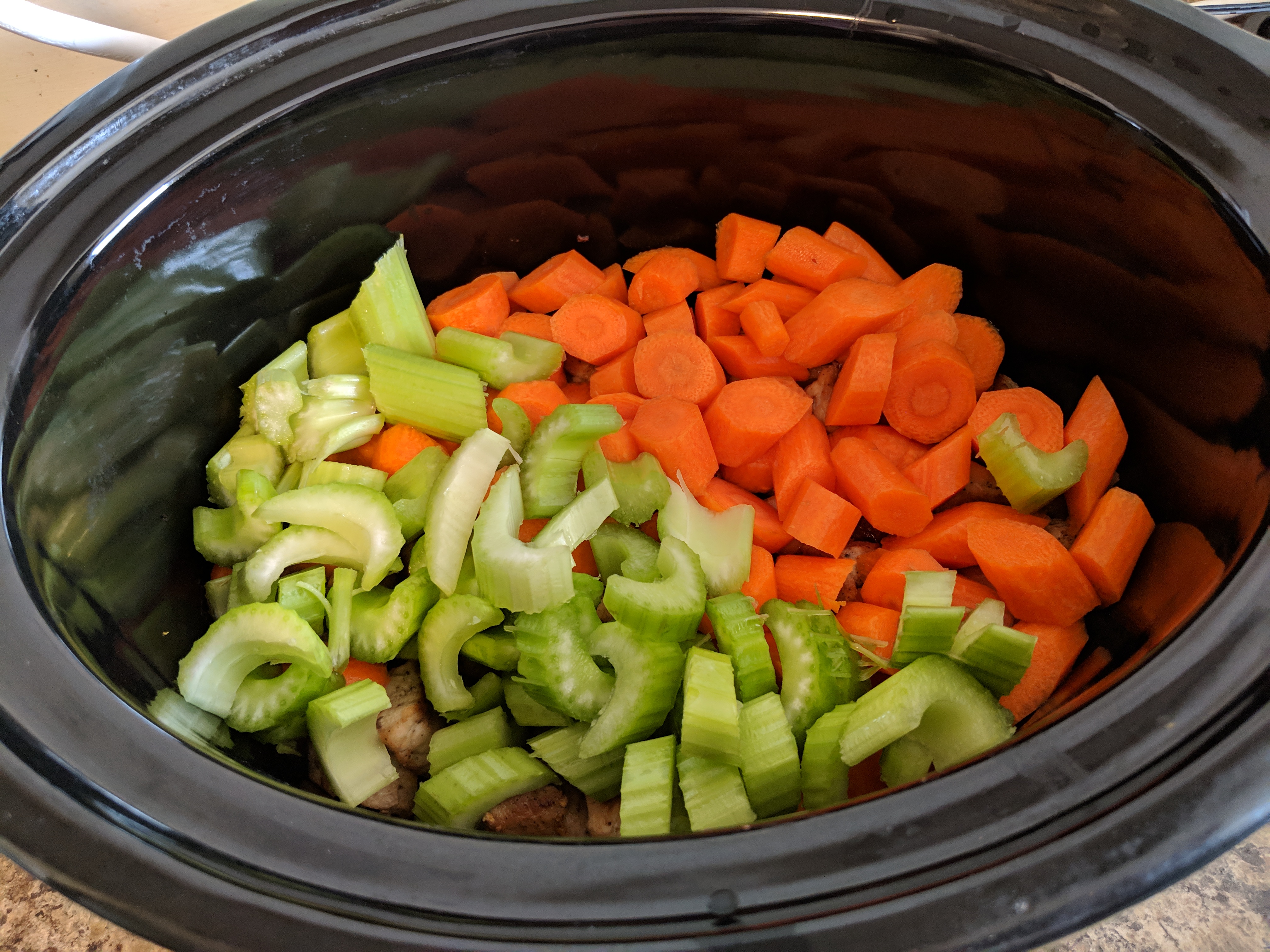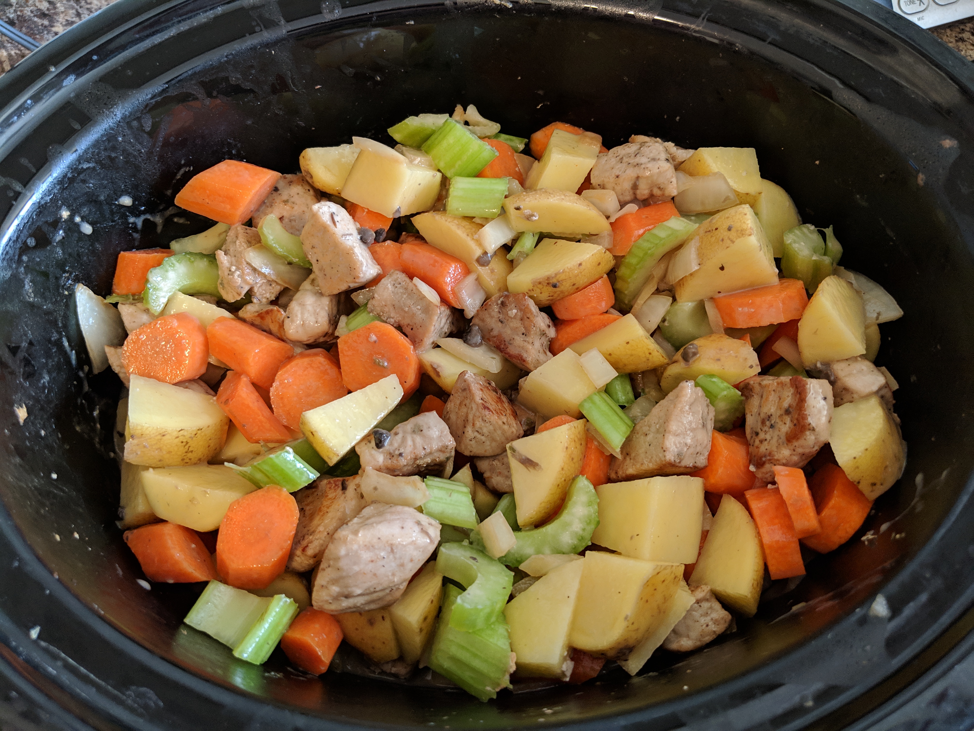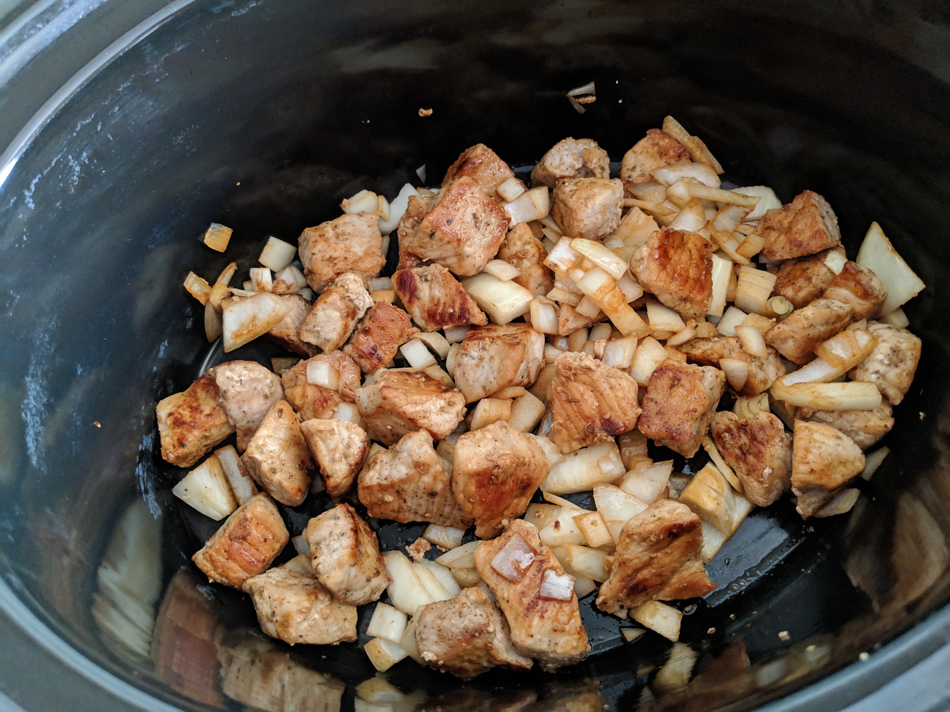(1) Quickly brown meat in olive oil, butter and spice as you like, add chopped onions and brown 5 min, put into slow cooker (2) chop your favorite vegetables as you like and add to slow cooker, sprinkle with salt & pepper and stir (3) In the pan you fried pork in add the can of mushroom soup and 1 and a half cans of water to the drippings, use a whisk to mix until soup is ready about 5 or 10 minutes (4) Pour on top of stew, mix well , let cook all afternoon on high , about 6 hours.