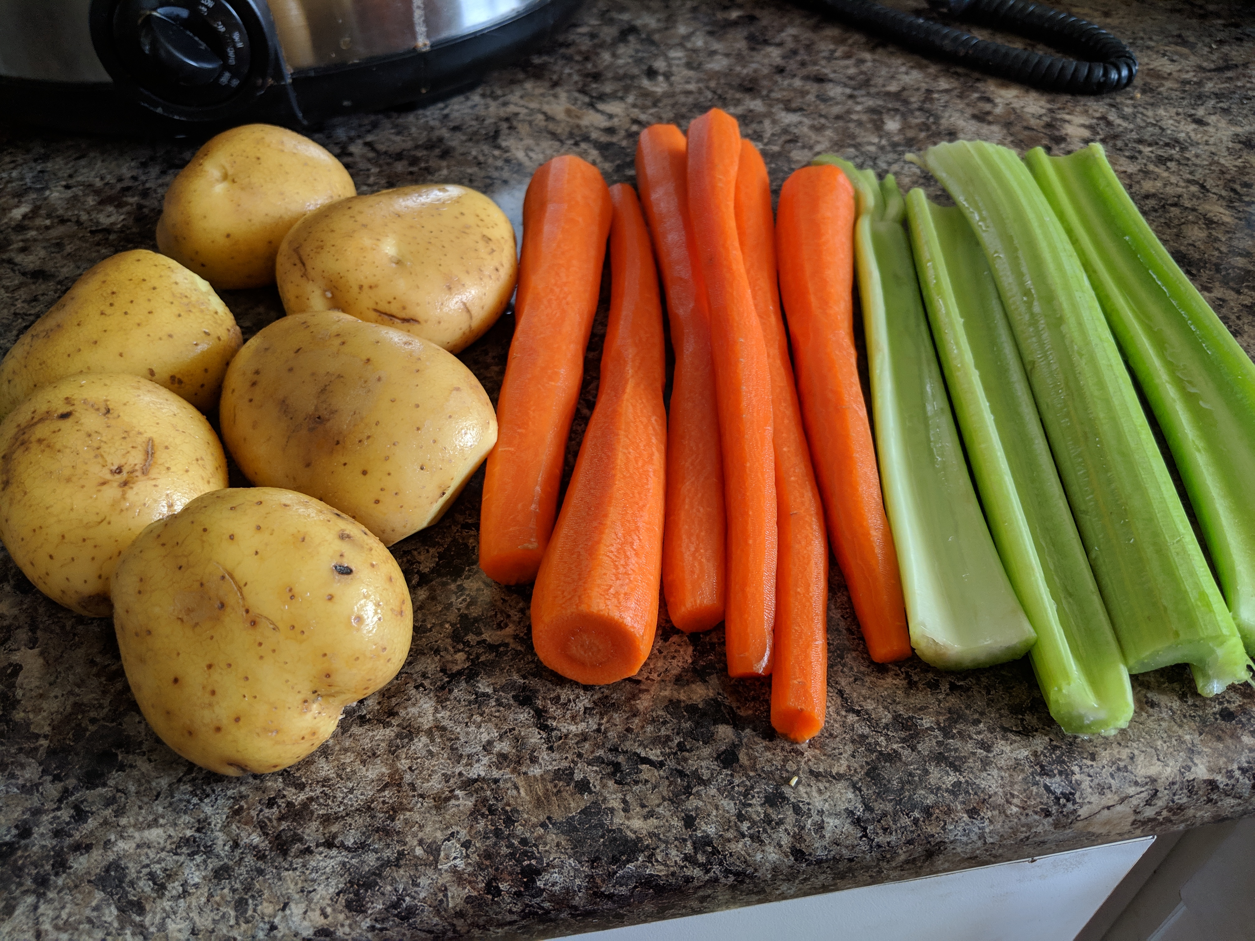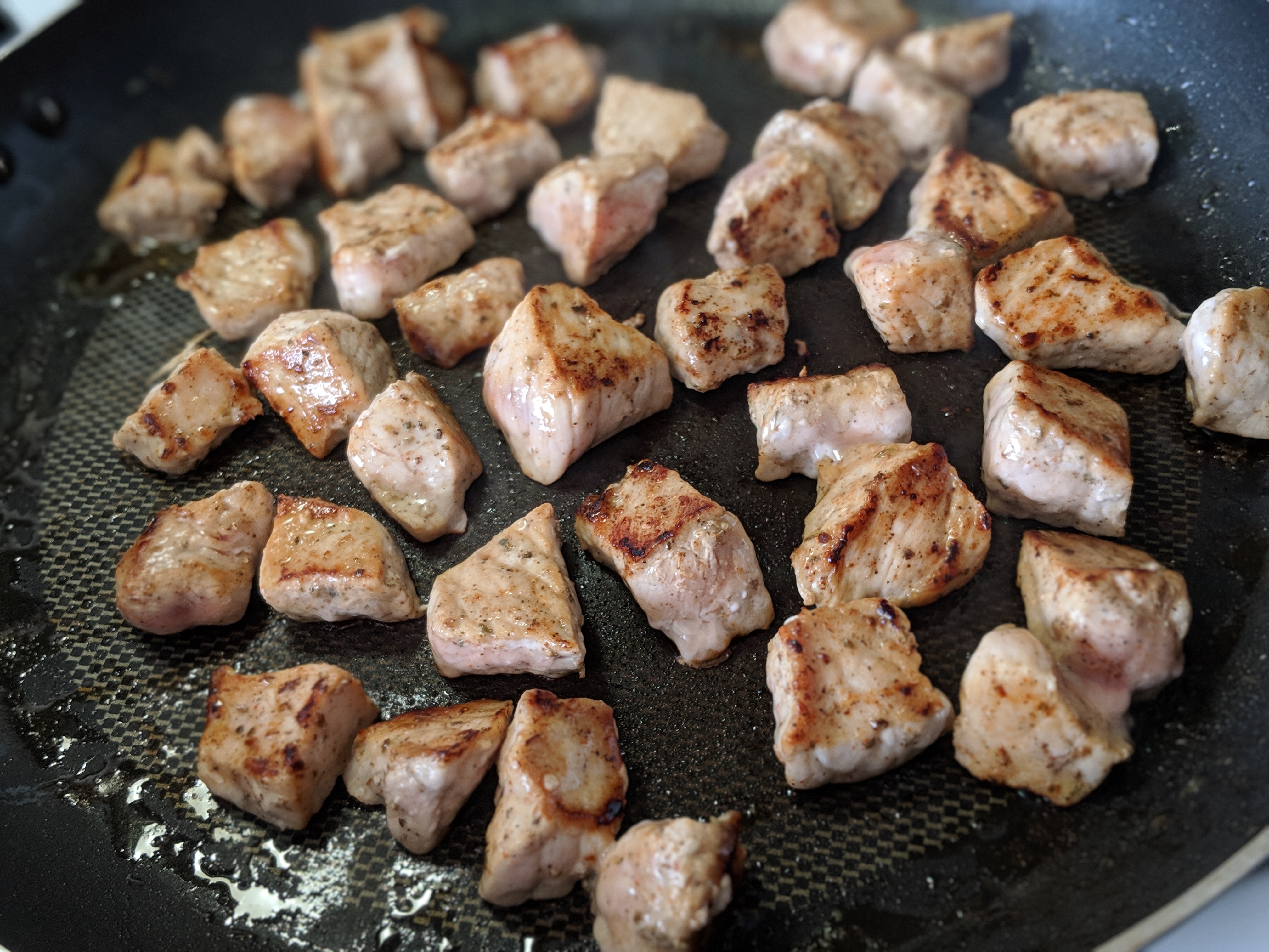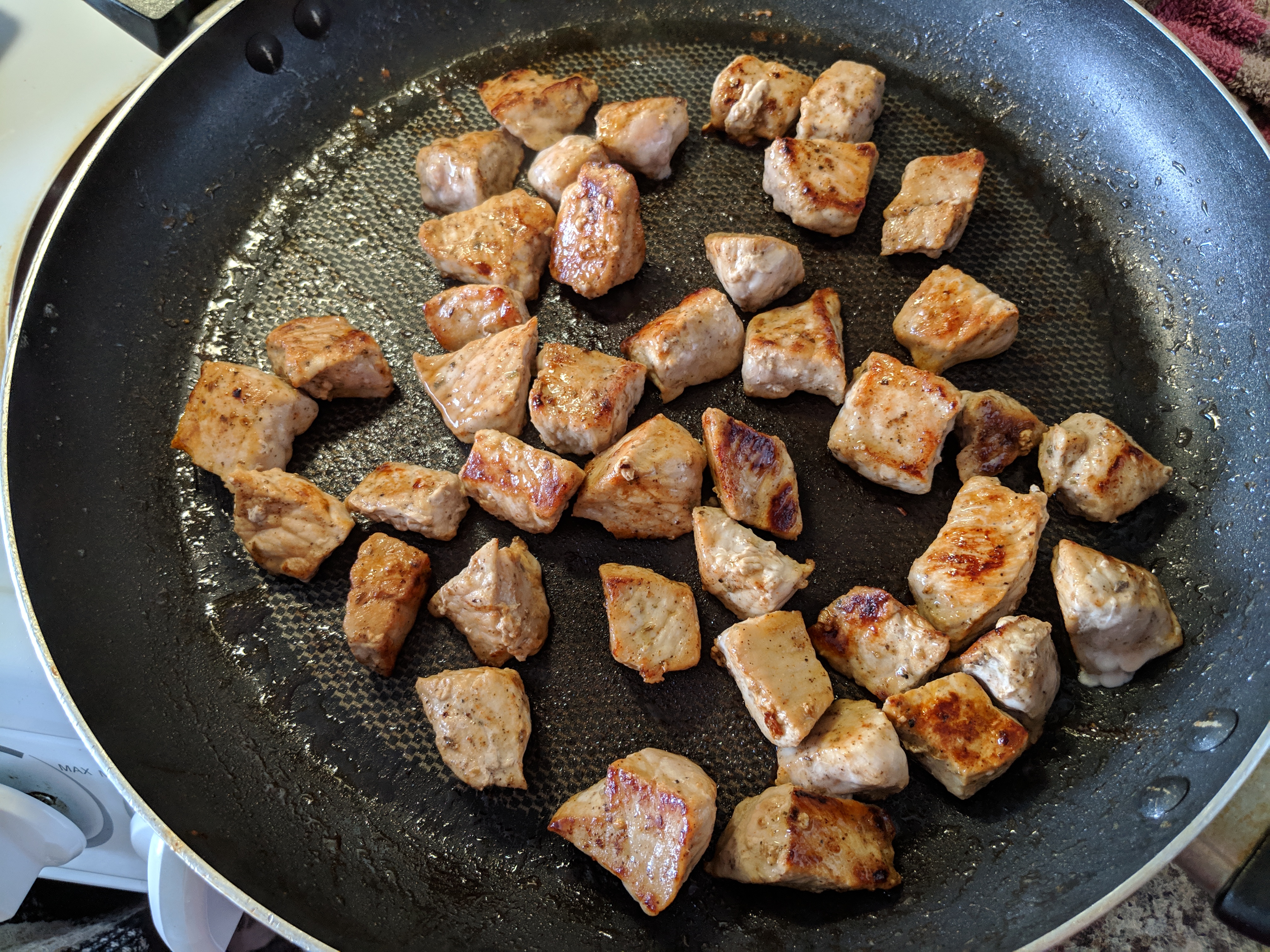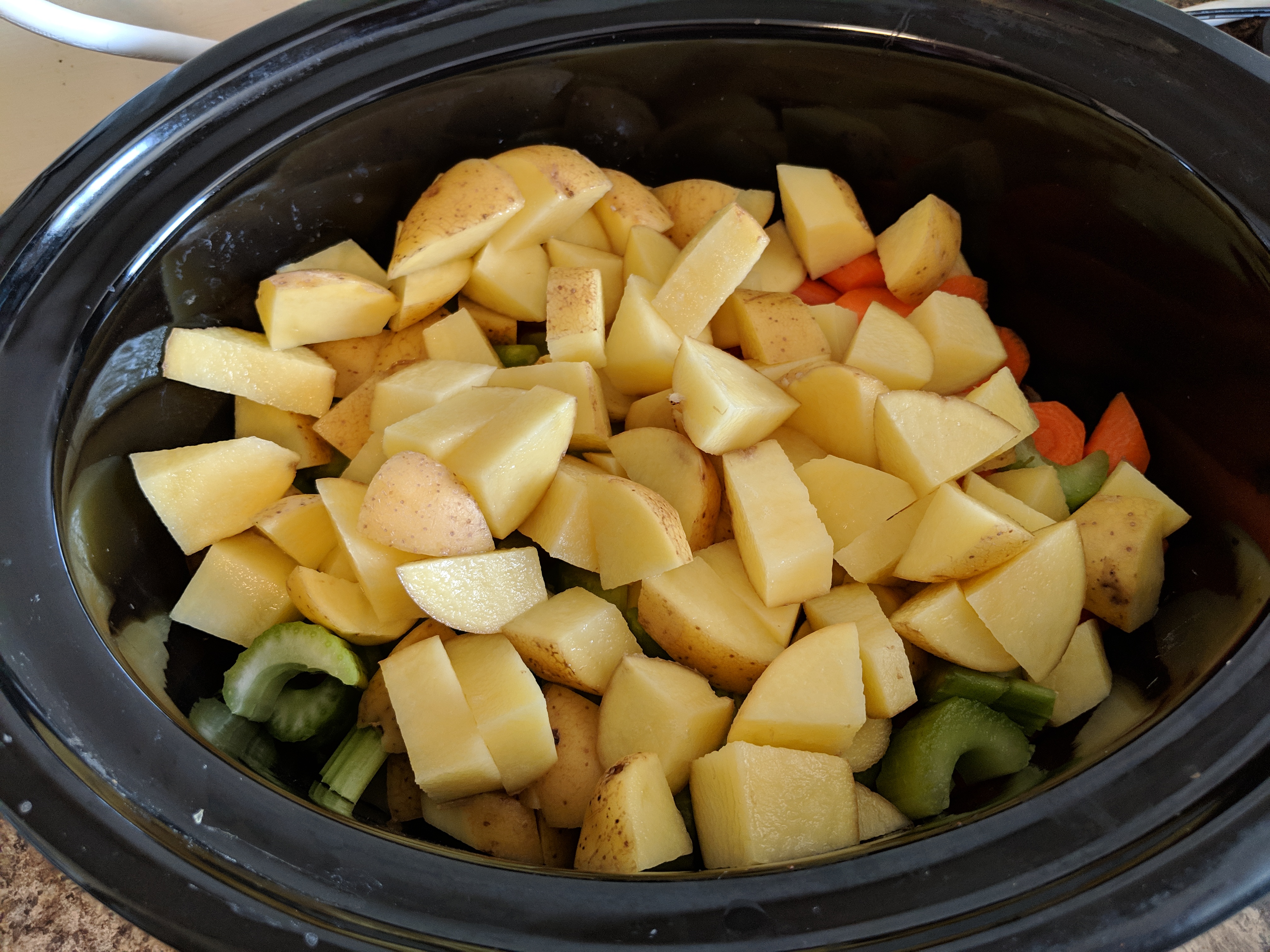 (1) Quickly brown meat in olive oil, butter and spice as you like, add chopped onions and brown 5 min, put into slow cooker (2) chop your favorite vegetables as you like and add to slow cooker, sprinkle with salt & pepper and stir (3) In the pan you fried pork in add the can of mushroom soup and 1 and a half cans of water to the drippings, use a whisk to mix until soup is ready about 5 or 10 minutes (4) Pour on top of stew, mix well , let cook all afternoon on high , about 6 hours.