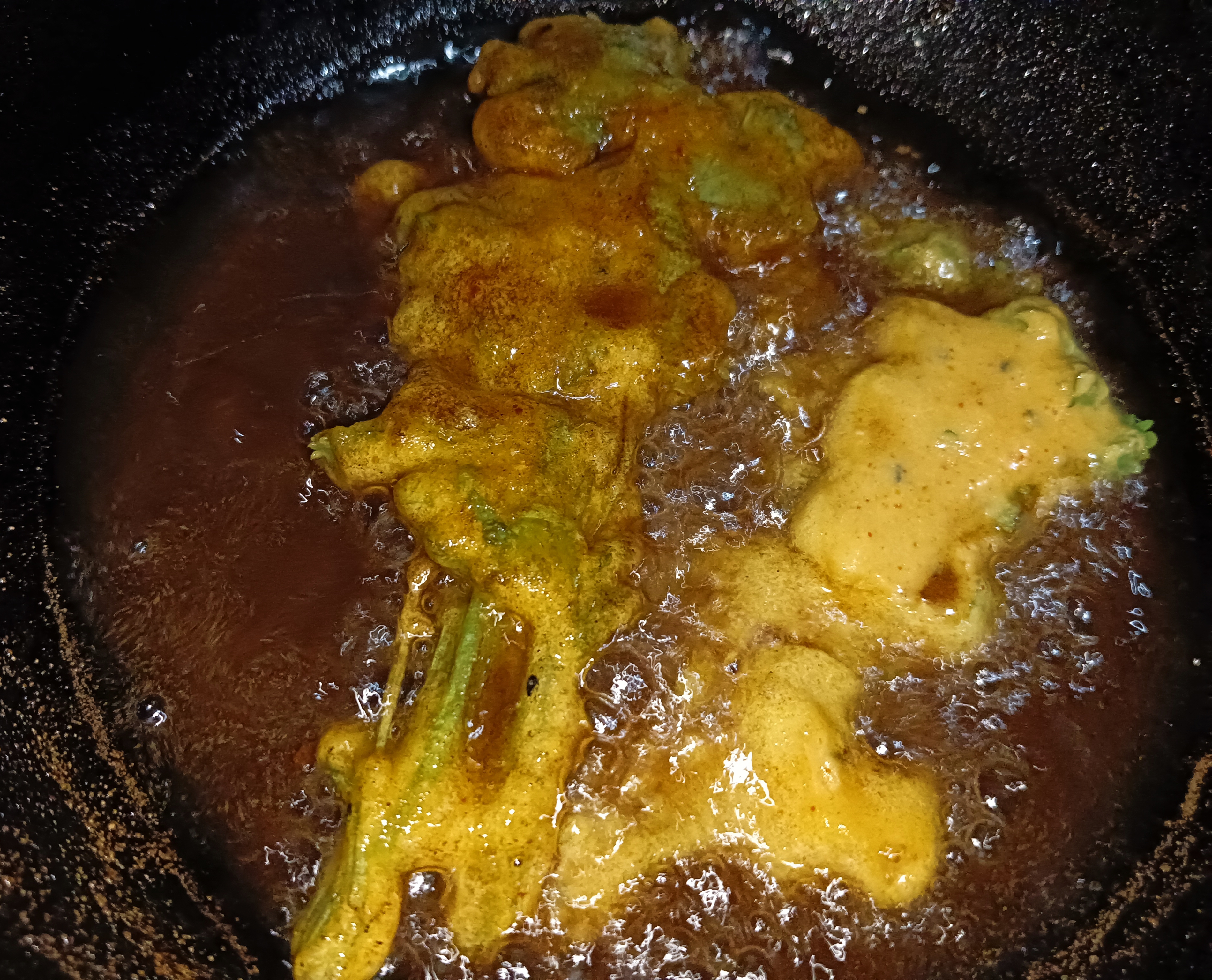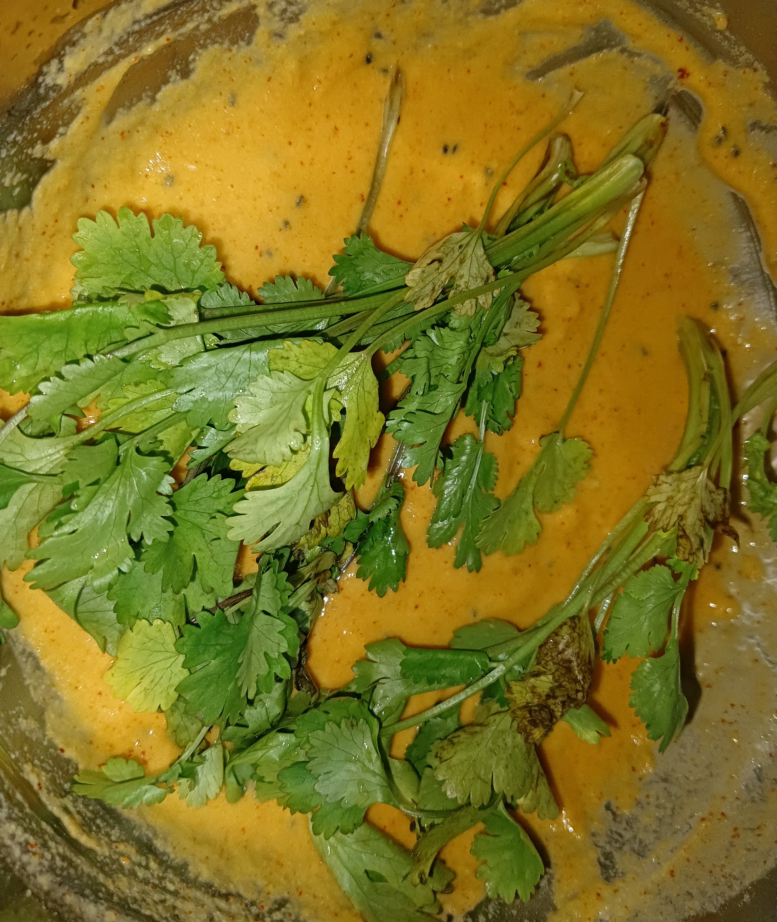 তেল গরম হয়ে গেছে এবার বেসন মাখানো ধনেপাতা একটা একটা করে ভাজার জন্য কড়াইতে দিয়ে দিলাম।