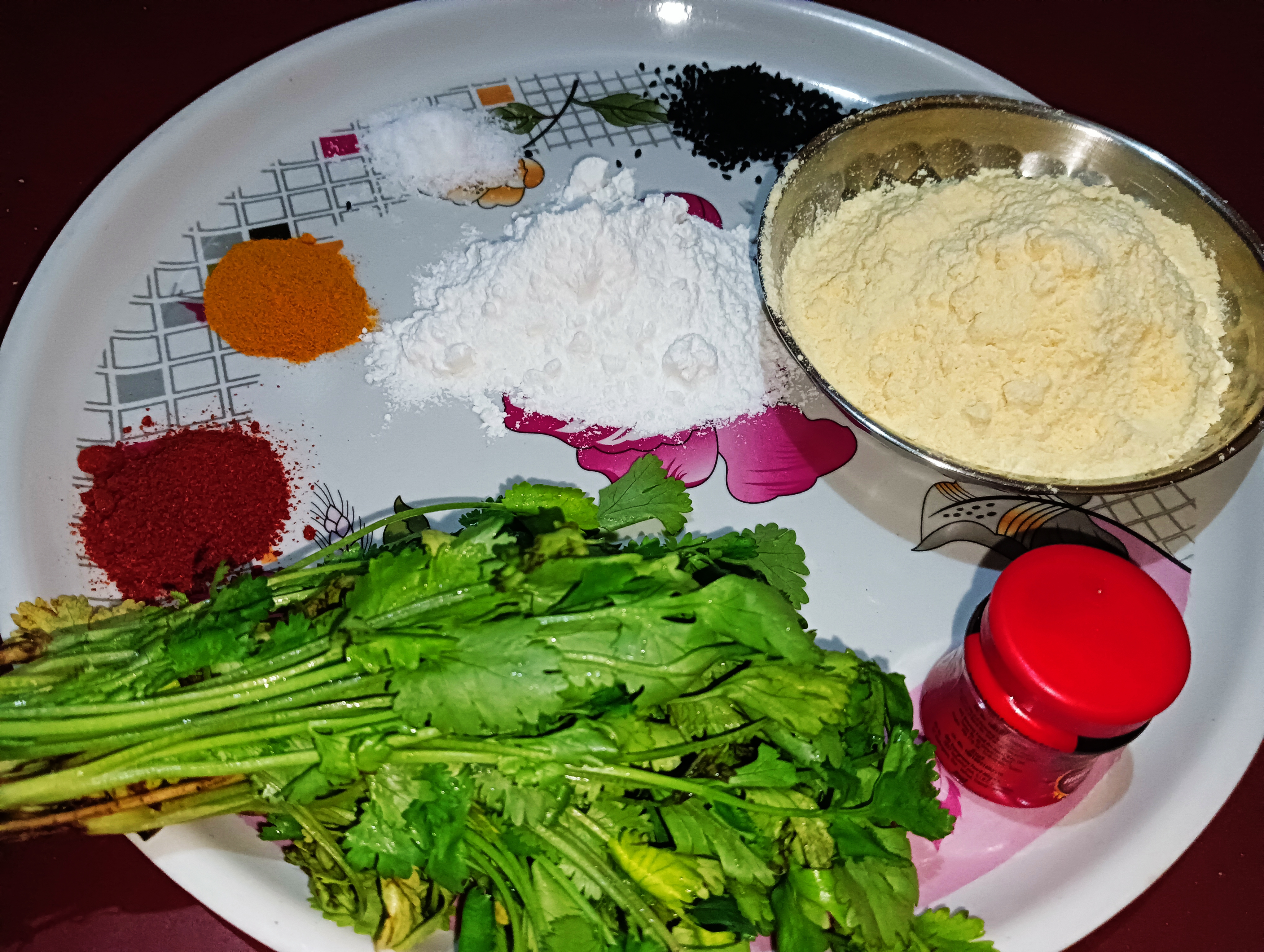প্রথমে একটি প্লেটে সাজিয়ে নিলাম আমার আজকের উপকরণ - ধনেপাতা, বেসন, চালের গুঁড়ো, লঙ্কা গুঁড়ো,কালো জিরে, লবণ, হলুদ, হিং।