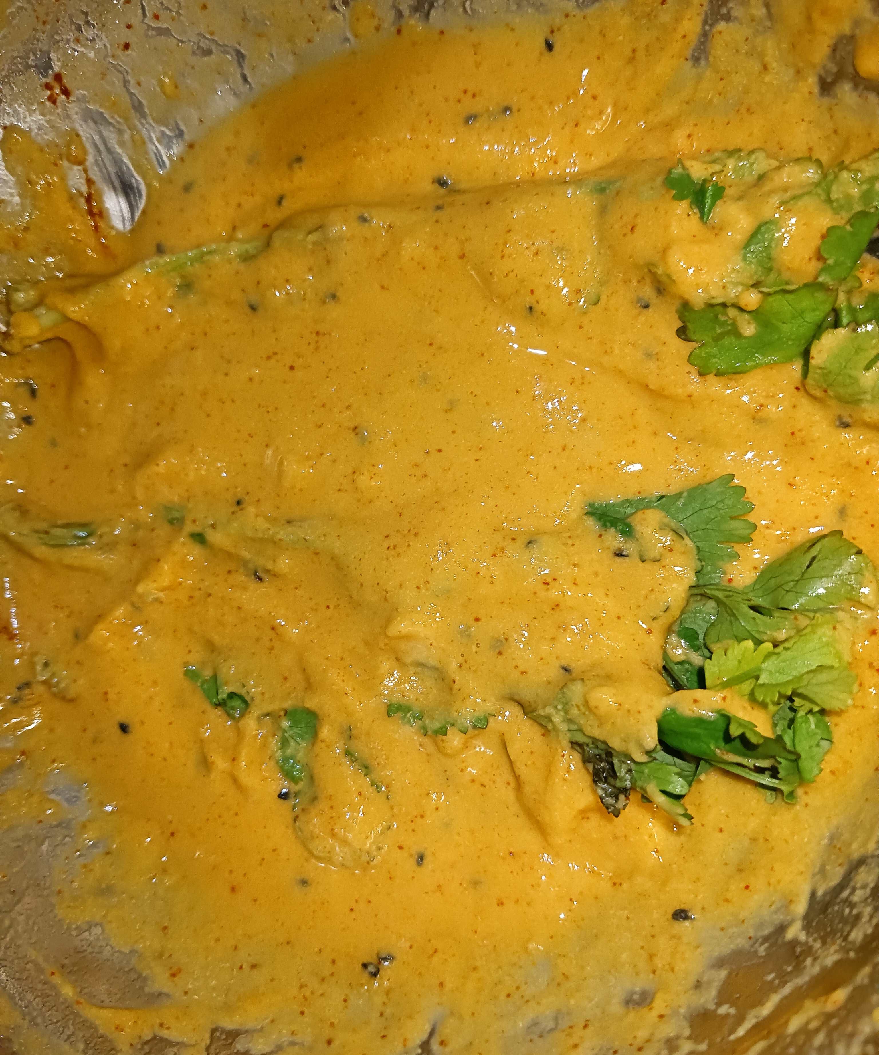 এবার বেসন এর গোলাটা ধনেপাতার গায়ে ভালো করে মাখিয়ে নিলাম।