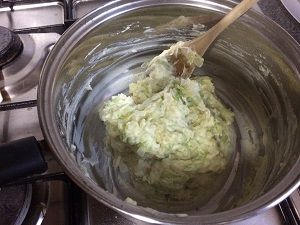 Stir in the nutmeg, cream, gherkins, parsley and half the cheese.