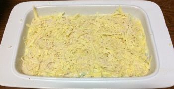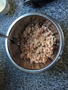 Drain the can of tuna, adding the brine to the milk. Break up the tuna with a fork. Preheat the oven to 180 C.