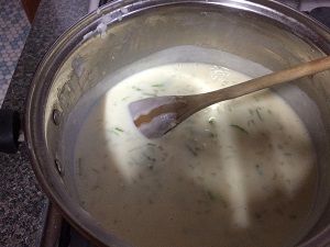 Remove from the heat and slowly mix in the milk and brine. Start with 1/4 cup at a time. When half the liquid is mixed in, add 1/2 cup at a time until it's all mixed in.