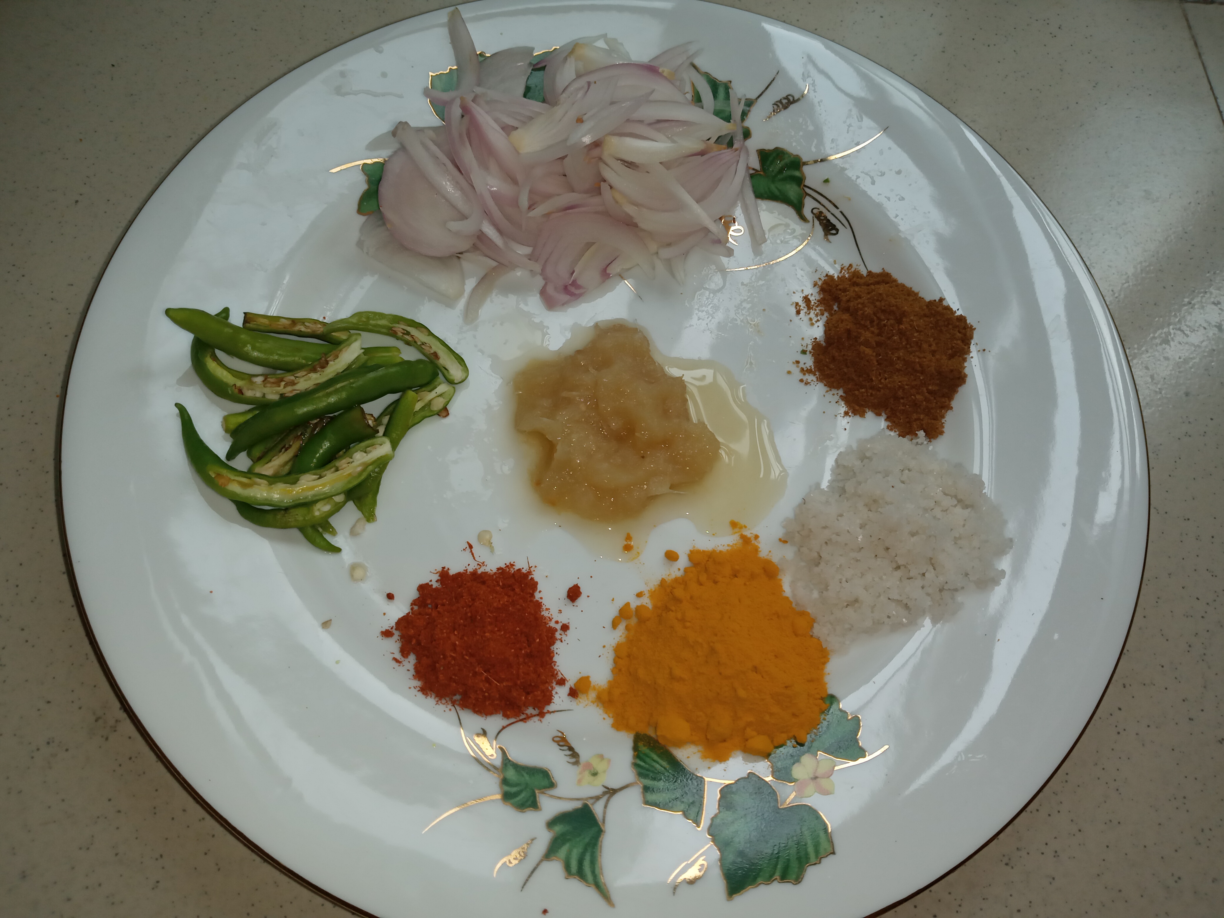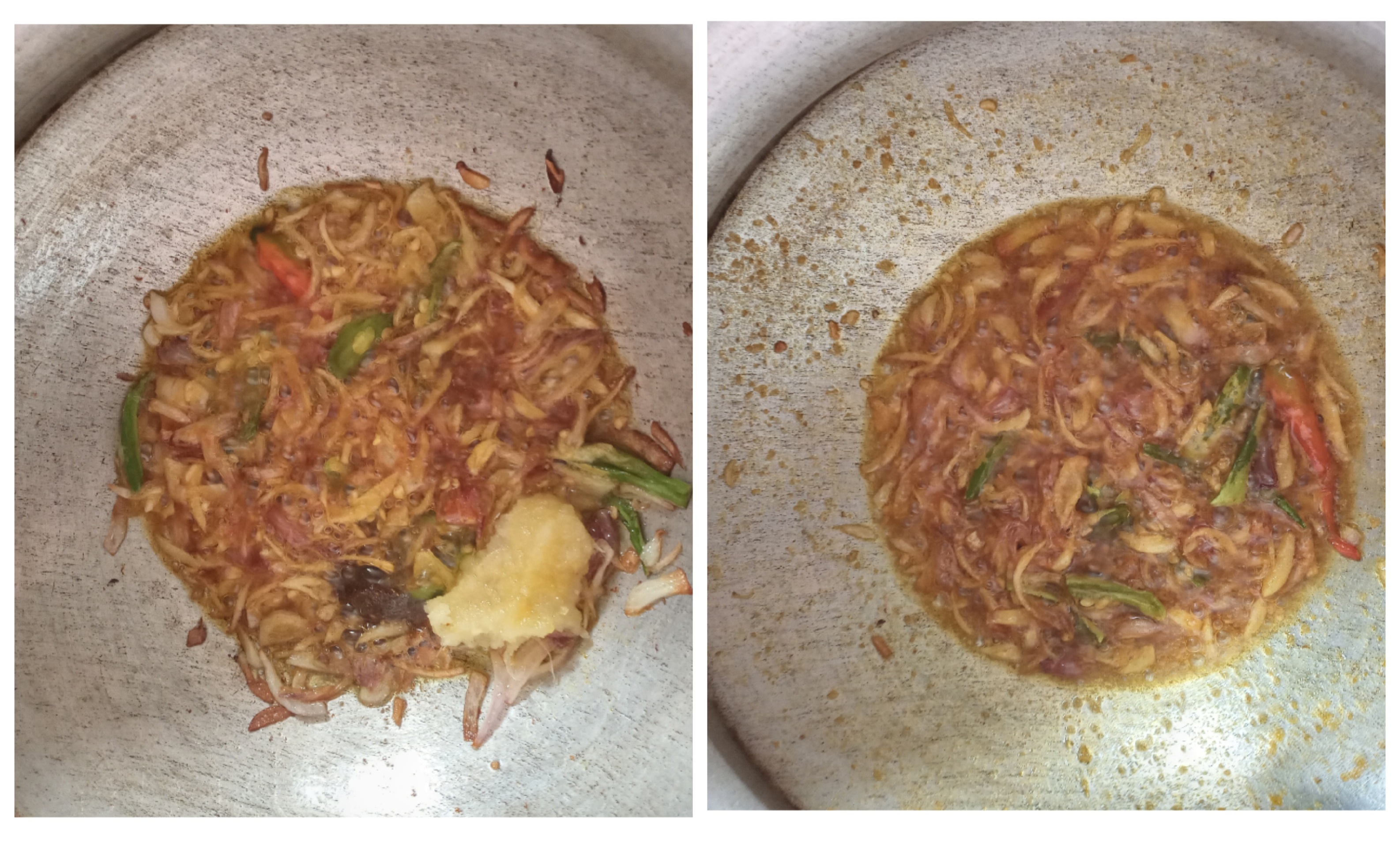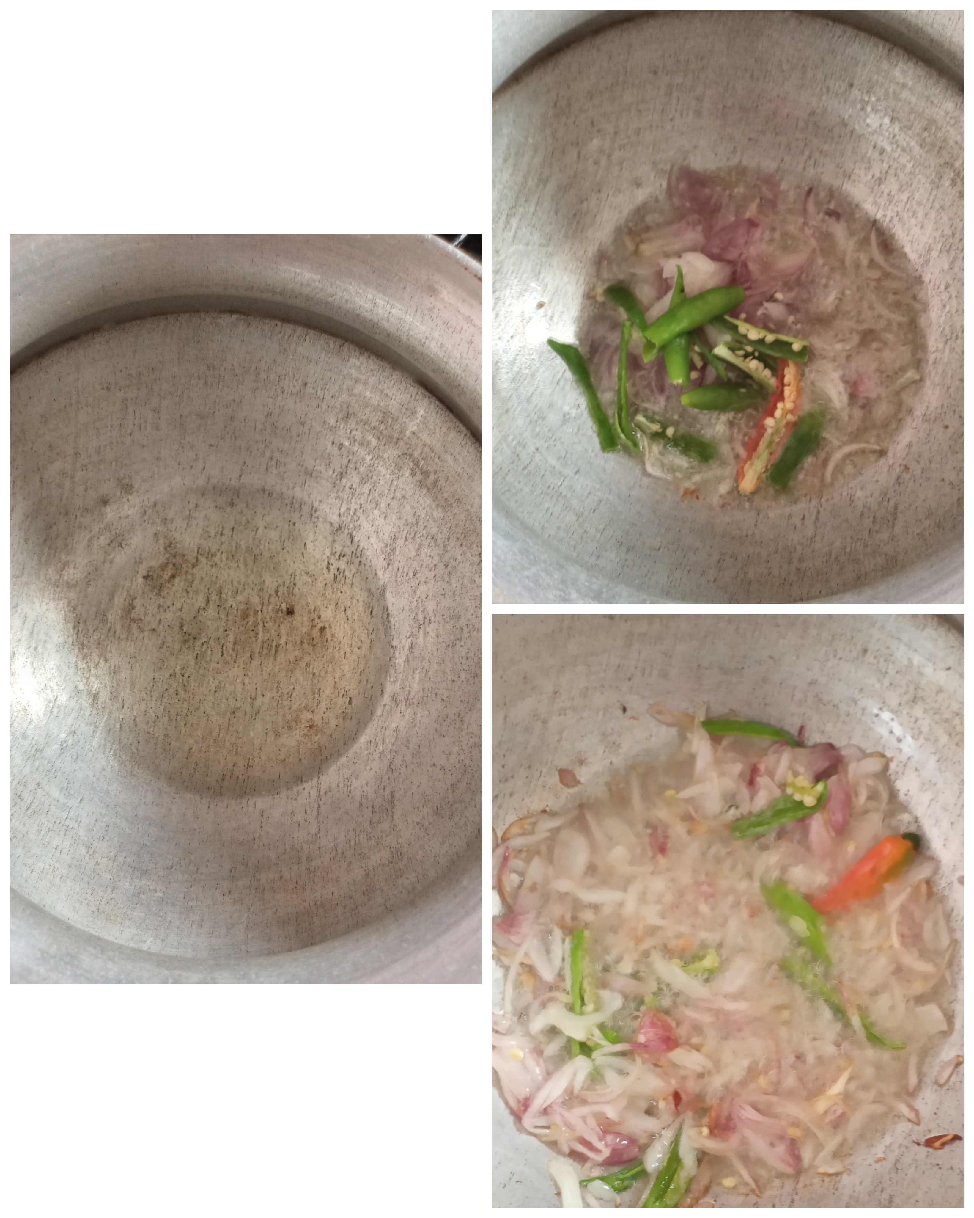- প্রথমে আমি চুলায় একটি পাতিল বসালাম। তারপর এর মধ্যে পরিমাণ মতো তেল দিয়ে তেলের মধ্যে পেঁয়াজ কাঁচামরিচ দিয়ে কিছুক্ষণ ভেজে নিলাম।