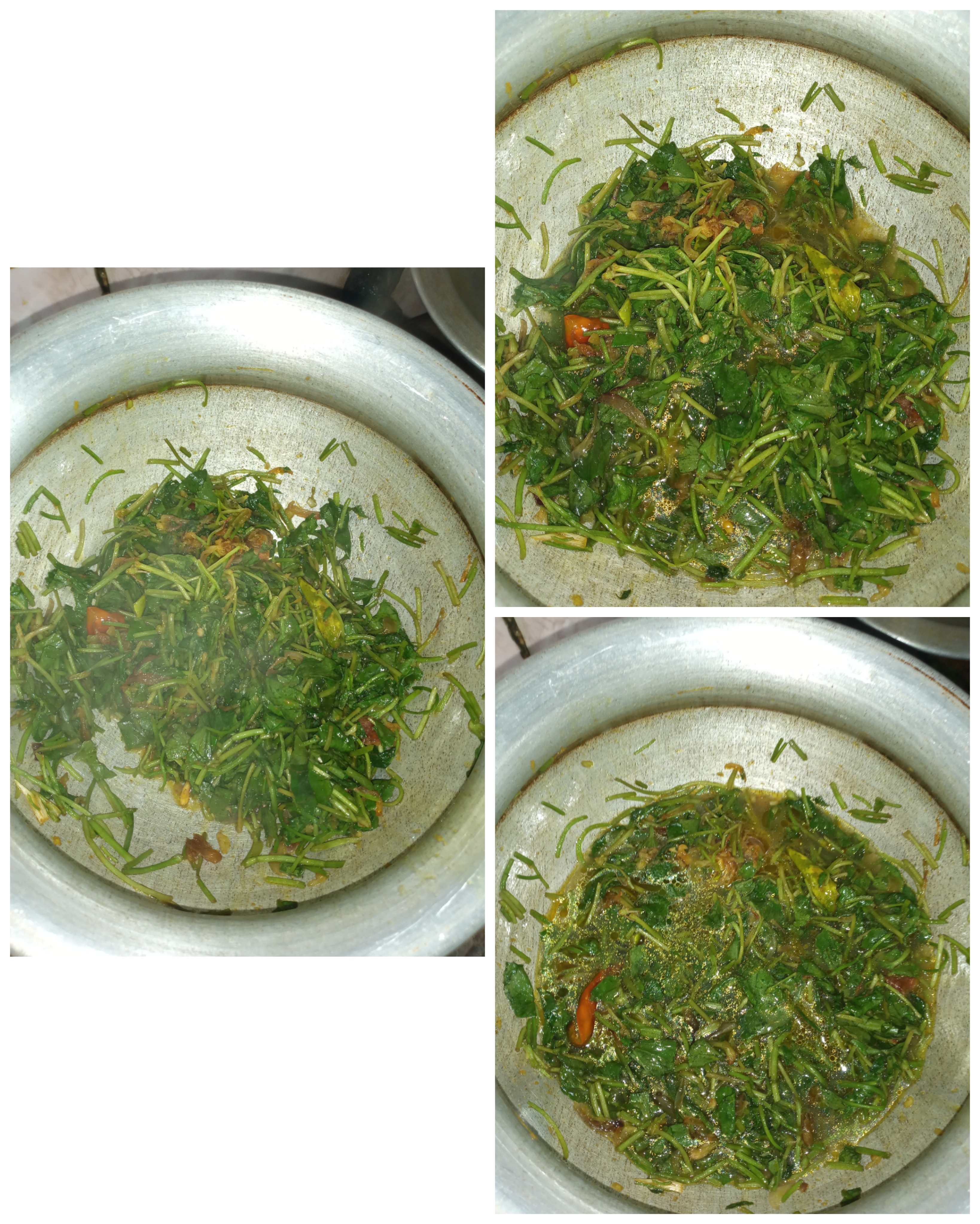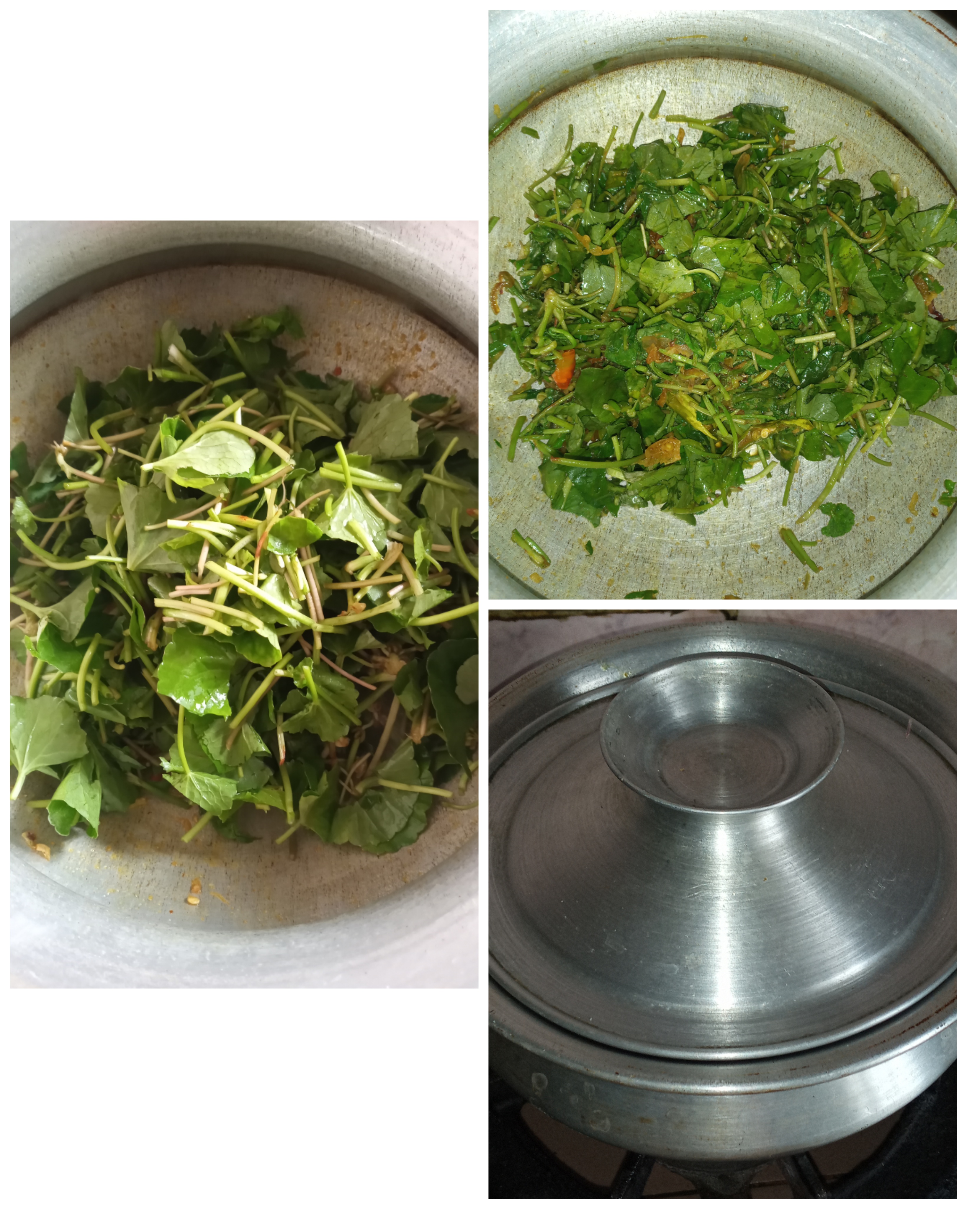 - কিছুক্ষণ পর ঢাকনা উঠিয়ে দেখলাম থানকুনি পাতাগুলো কষানো হয়ে গেছে। তারপর এর মধ্যে পরিমাণ মতো পানি দিয়ে পানিটা বলক আসার জন্য অপেক্ষা করলাম।