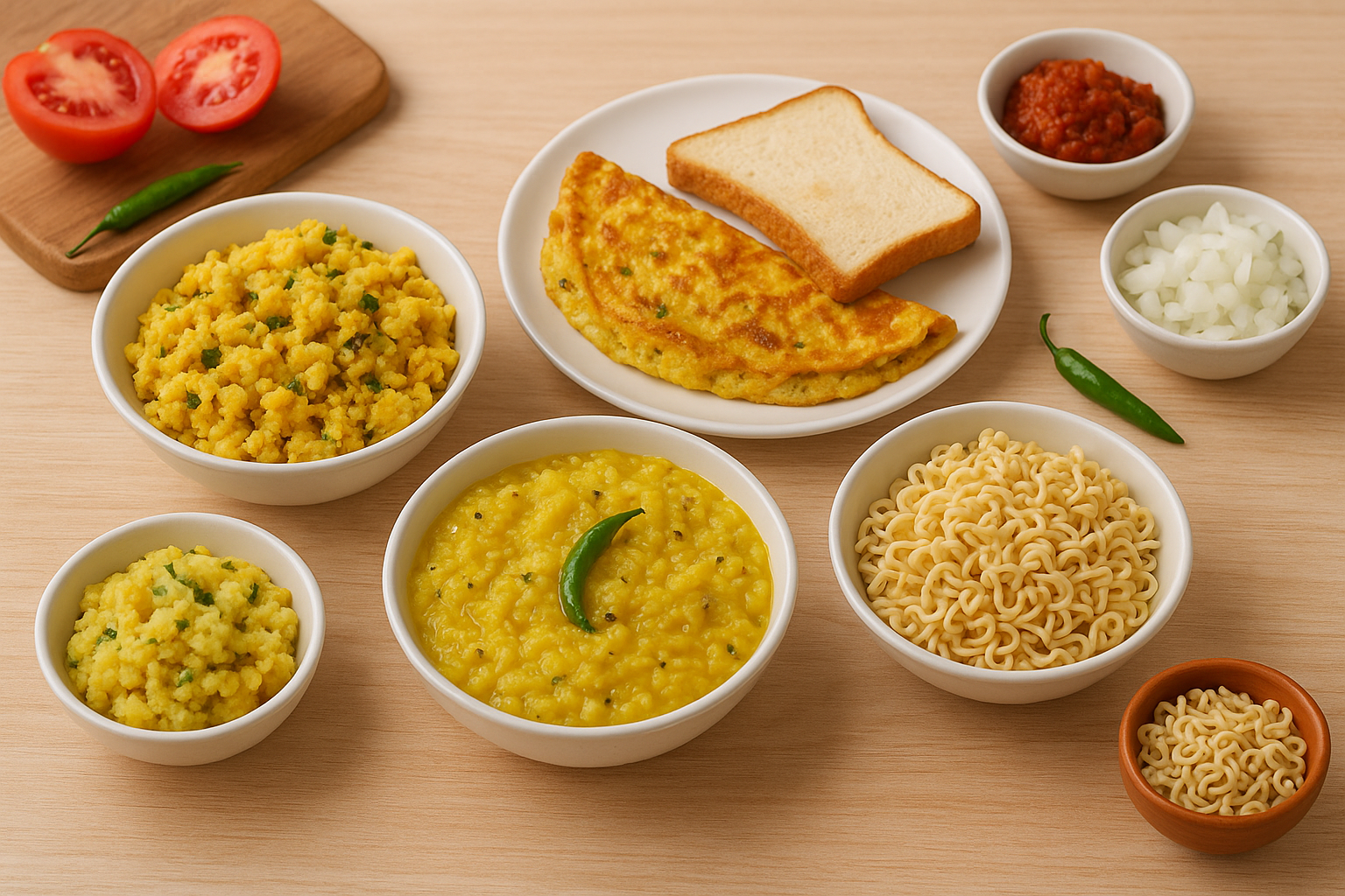 এইরকম আরো কিছু উপকরণ আছে, যেমন- নুডুলস। এটা হচ্ছে আরো কম সময়ের রেসিপি। ৪-৫ মিনিটের ব্যাপার, কারণ এটা অলরেডি প্যাকেট করা থাকে আর জলে দিয়ে ফুটিয়ে নিলেই হয়ে যায়। আর সাথে যদি একটু মশলা, সবজি অ্যাড করার দরকার হয়, তাহলে করে নেওয়া যায় সাথে সাথে। এর মতো আরো একটা হলো ব্রেড অমলেট, যেটা আমরা দোকানে খেয়ে থাকি। এটা ঝটপট একটা রেসিপি। এটা আসলে তেমন কিছু নয়, ডিমের সাথে সাধারণ কিছু উপকরণ মিশিয়ে তাতে ব্রেড এপিট-ওপিট করে ভেজে নিলেই তৈরী হয়ে গেলো। এইরকম বেশ কিছু আরো ছোটো ছোটো রেসিপি আছে, যা কম উপকরনে এবং সময় বাঁচিয়ে দ্রুত তৈরী করা যায়।