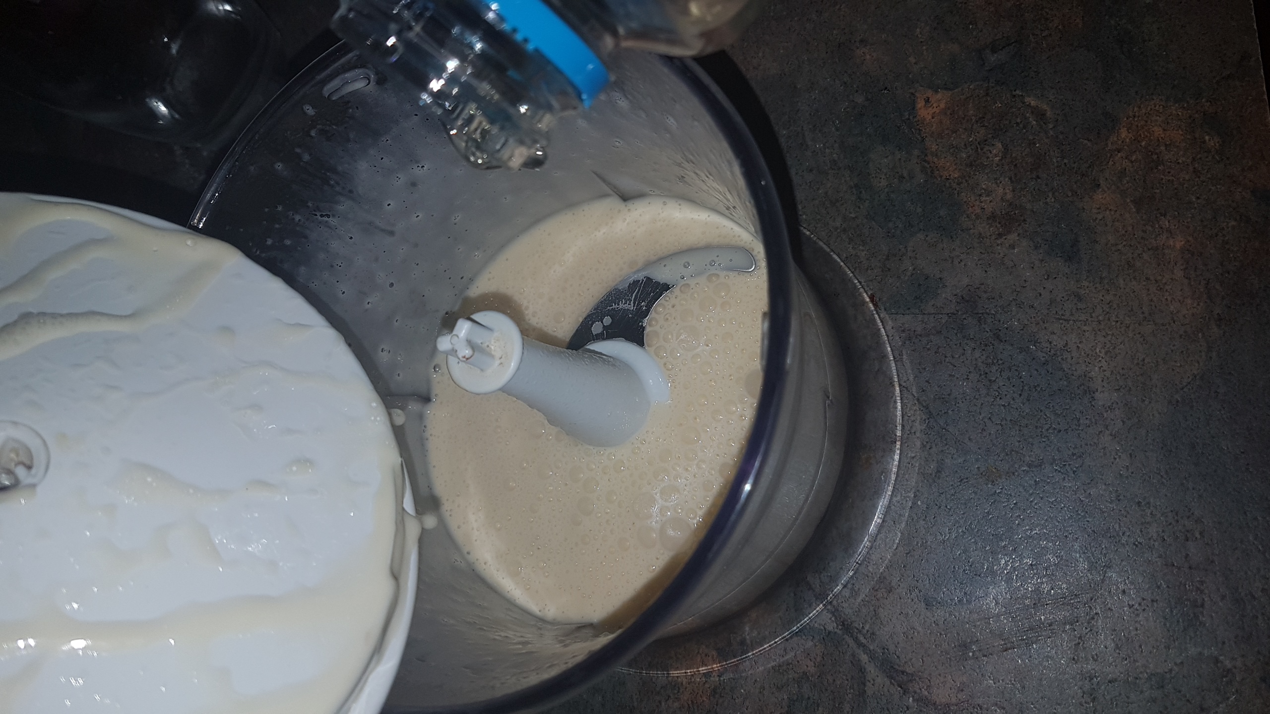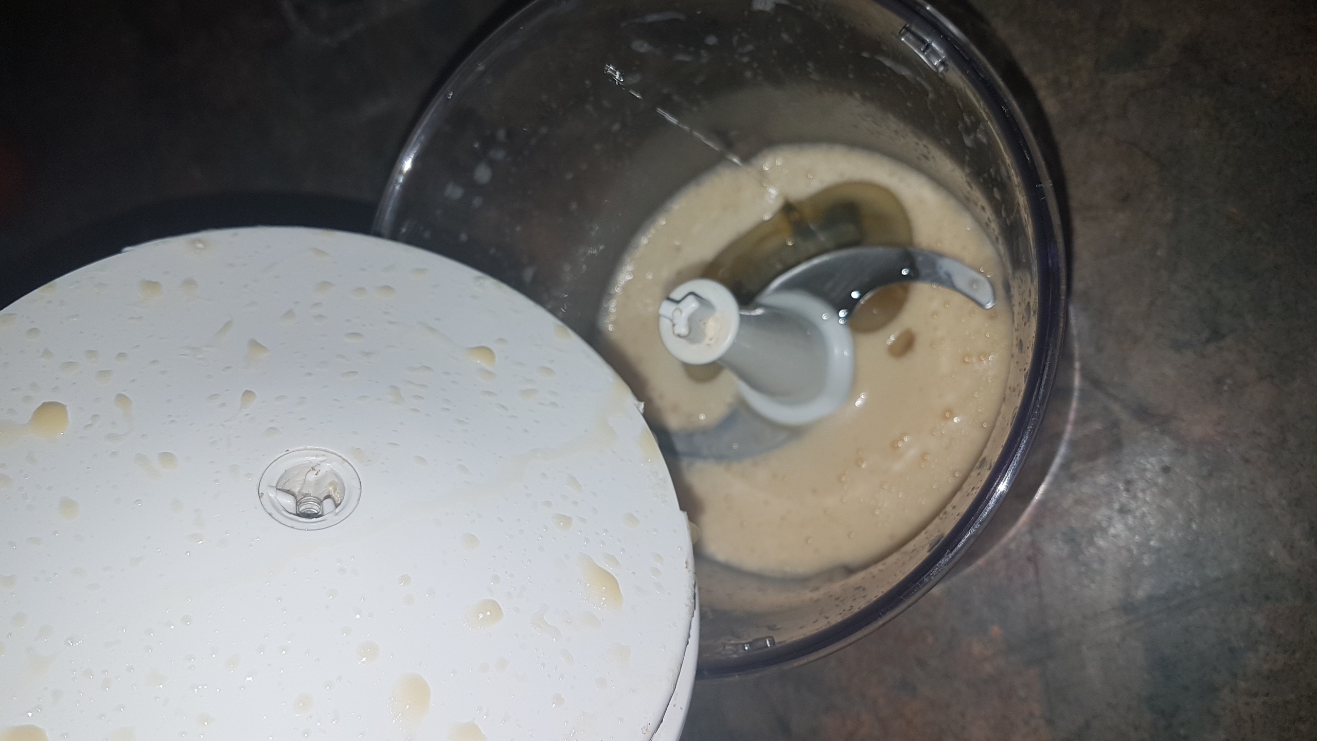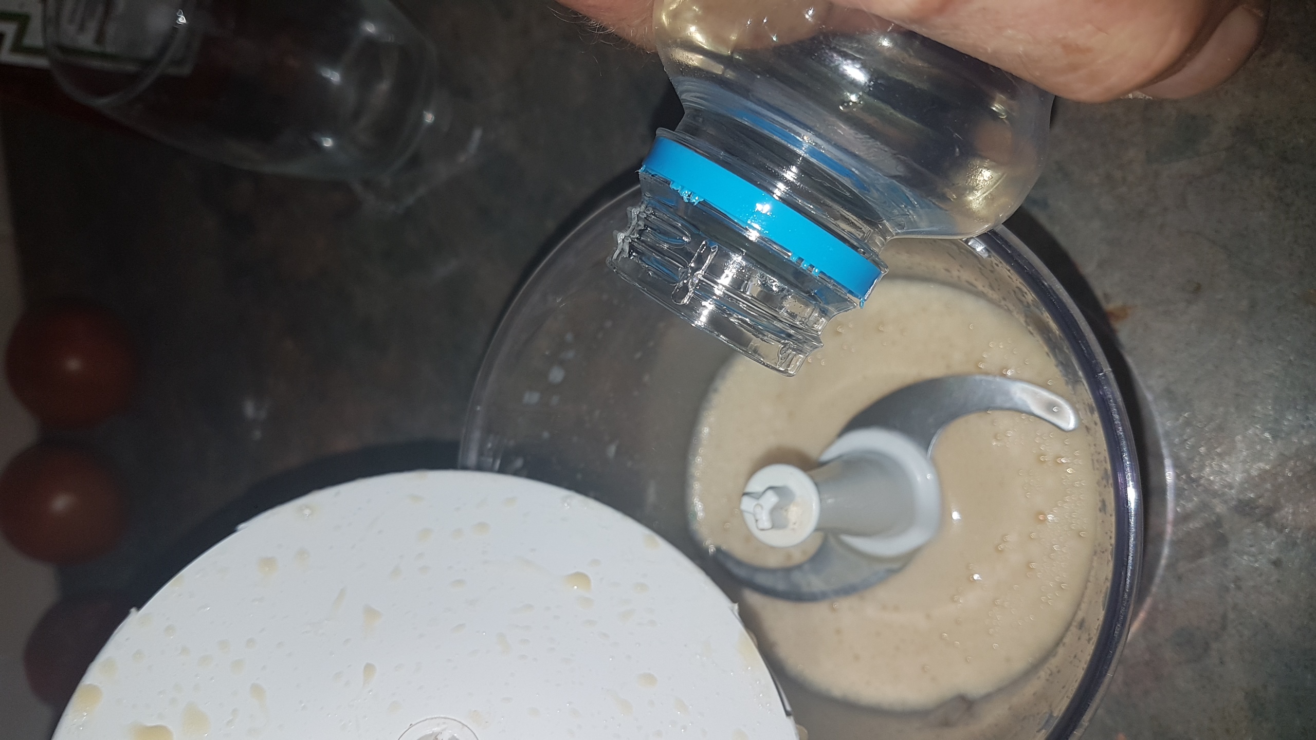 Some processors let you add as its running, but most oils dont fit through holes and it just gets messy :-) So take your time and add your oil slowly. If the mix seems to go weirld lumpy and seperate, add a tablespoon of luke warm water and this will bring it back to a colloide(smooth mix). I usually get about 375ml of oil in before im happy with the texture and richness, but you can keep adding oil for a lighter mayonaise.