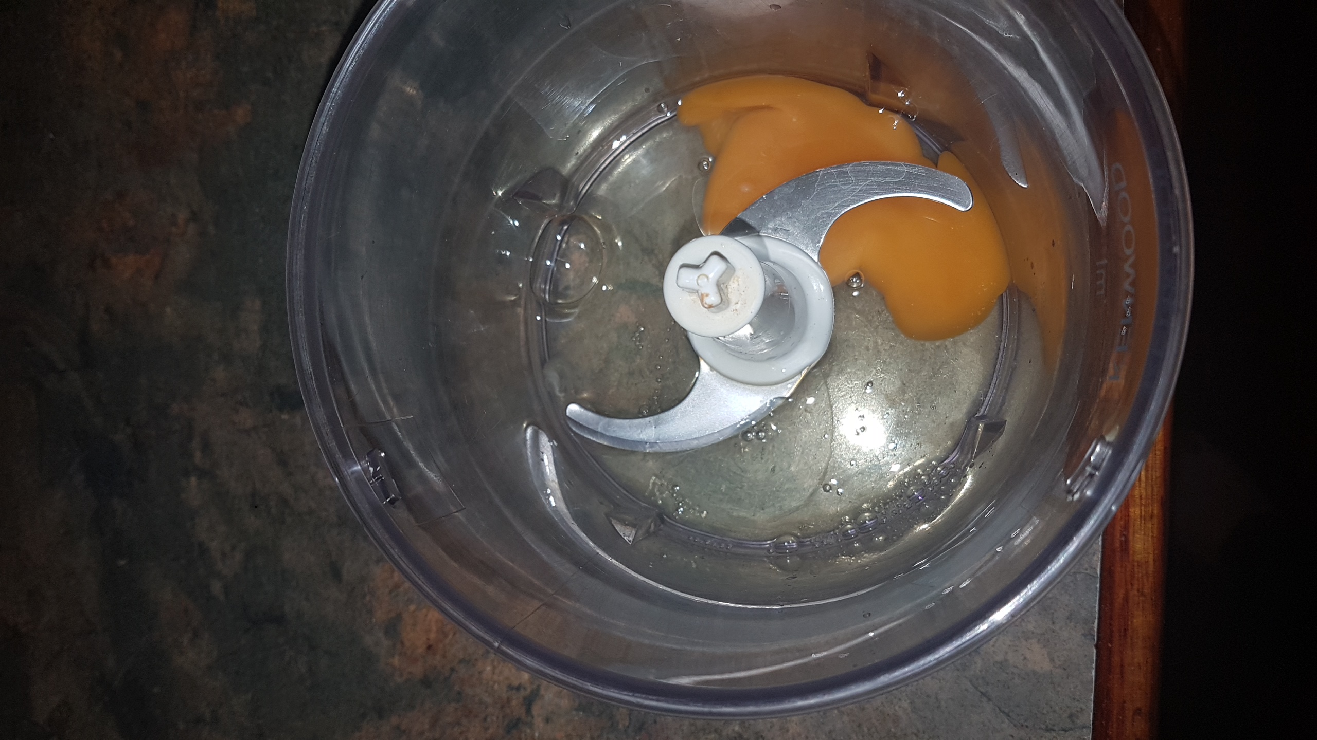 The hole egg and acid go into food processor and are well mixed.