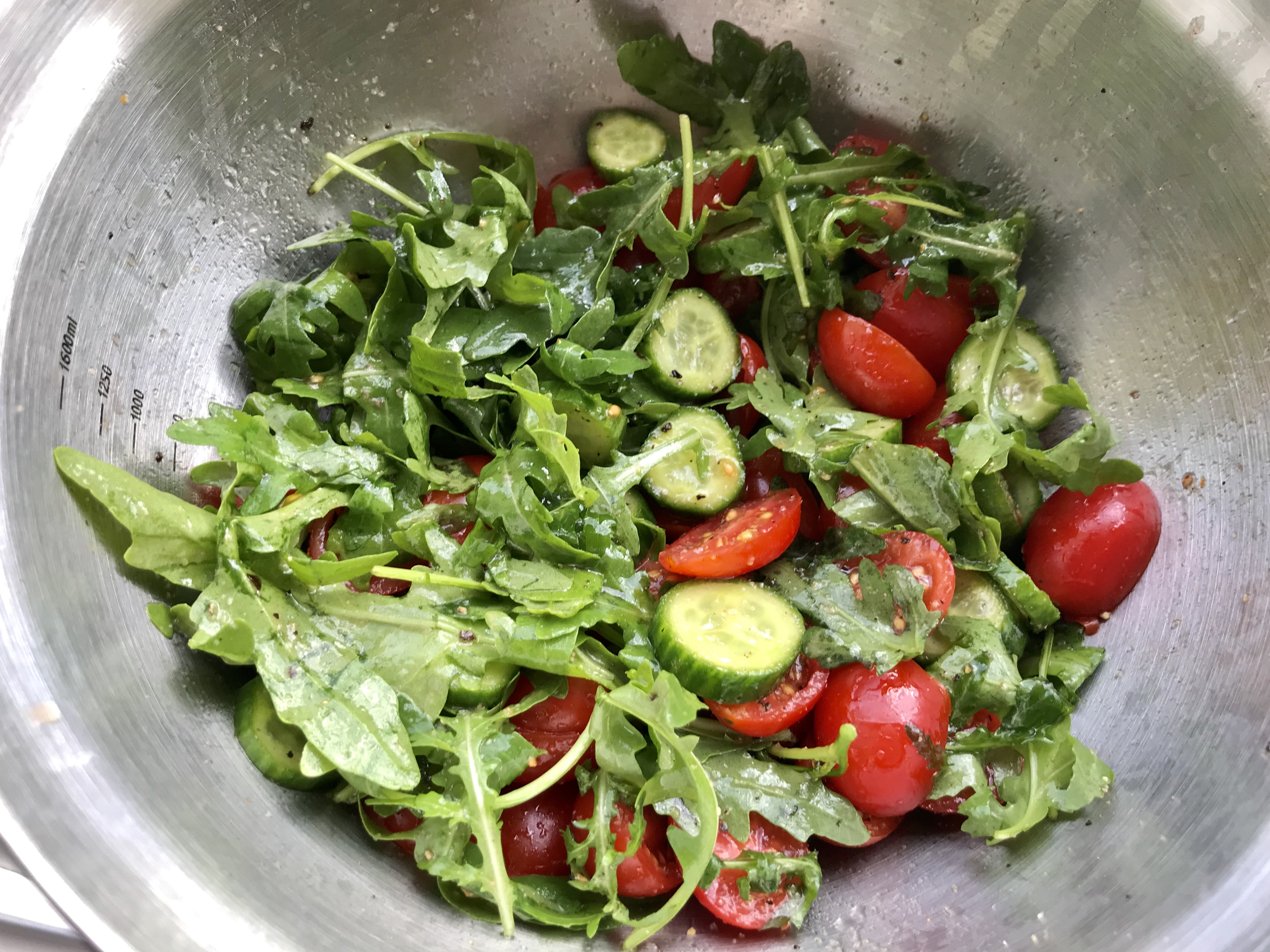 And of course I made a healthy salad with tomatoes, cucumbers and rocket salad leaves.
