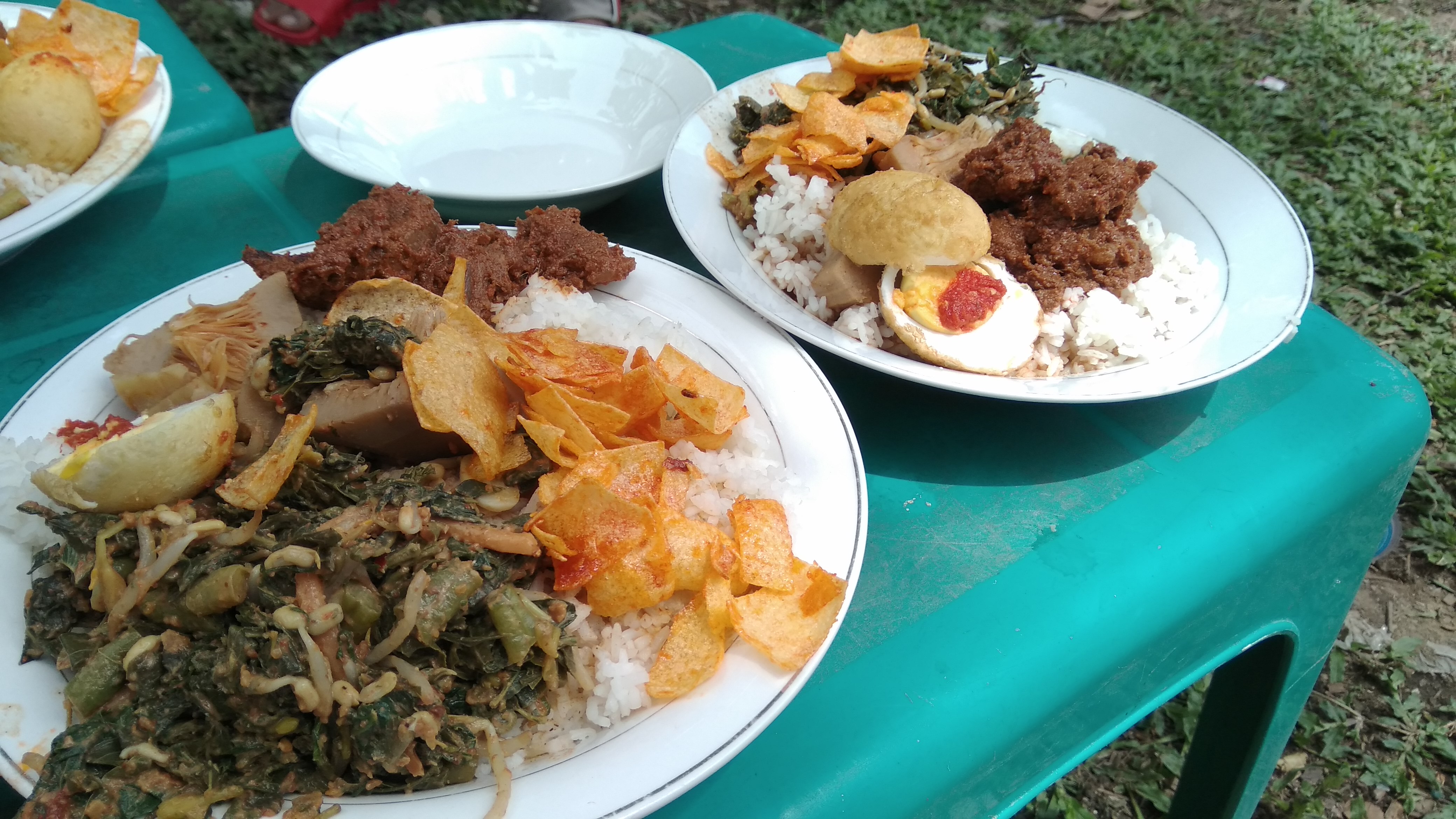 Makanan ini adalah menu yg dihidangkan oleh tuan rumah kepada tamu undangan. Rendang, telur, dan pecah. Serta beberapa aneka makanan penutup lainnya.