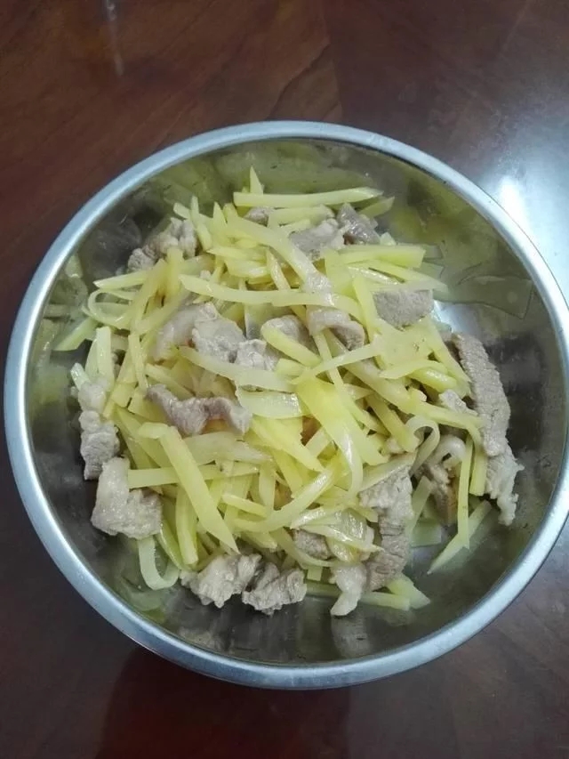 第一步:土豆洗净去皮然后在案板上切丝,猪肉洗净切片备用(土豆切好的丝用水泡一下去除一下里面的淀粉)