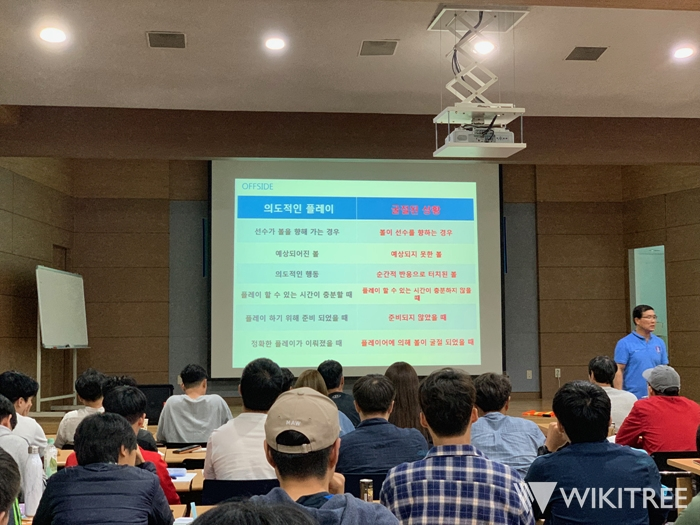 복잡한 오프사이드 규정에 관한 설명을 듣고 있는 교육생