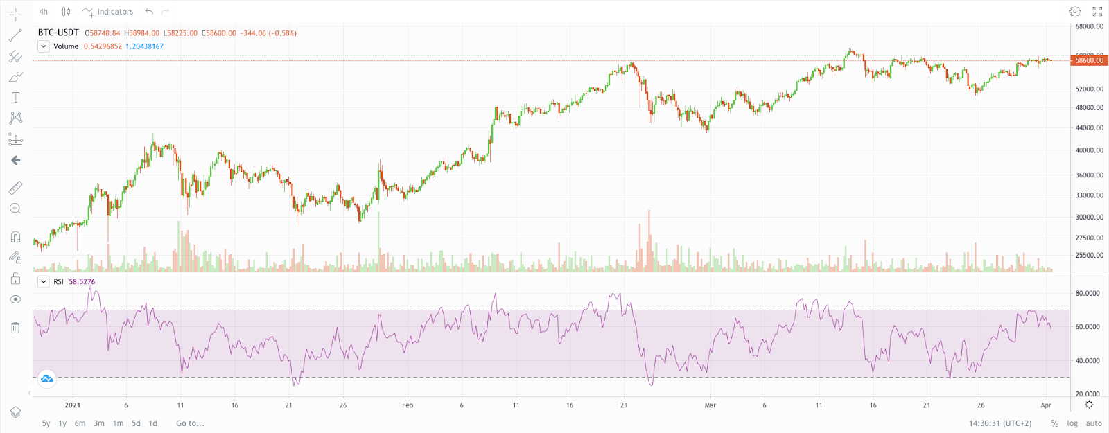 An asset is typically considered oversold when the RSI drops below 30 and overbought if it goes above 70.