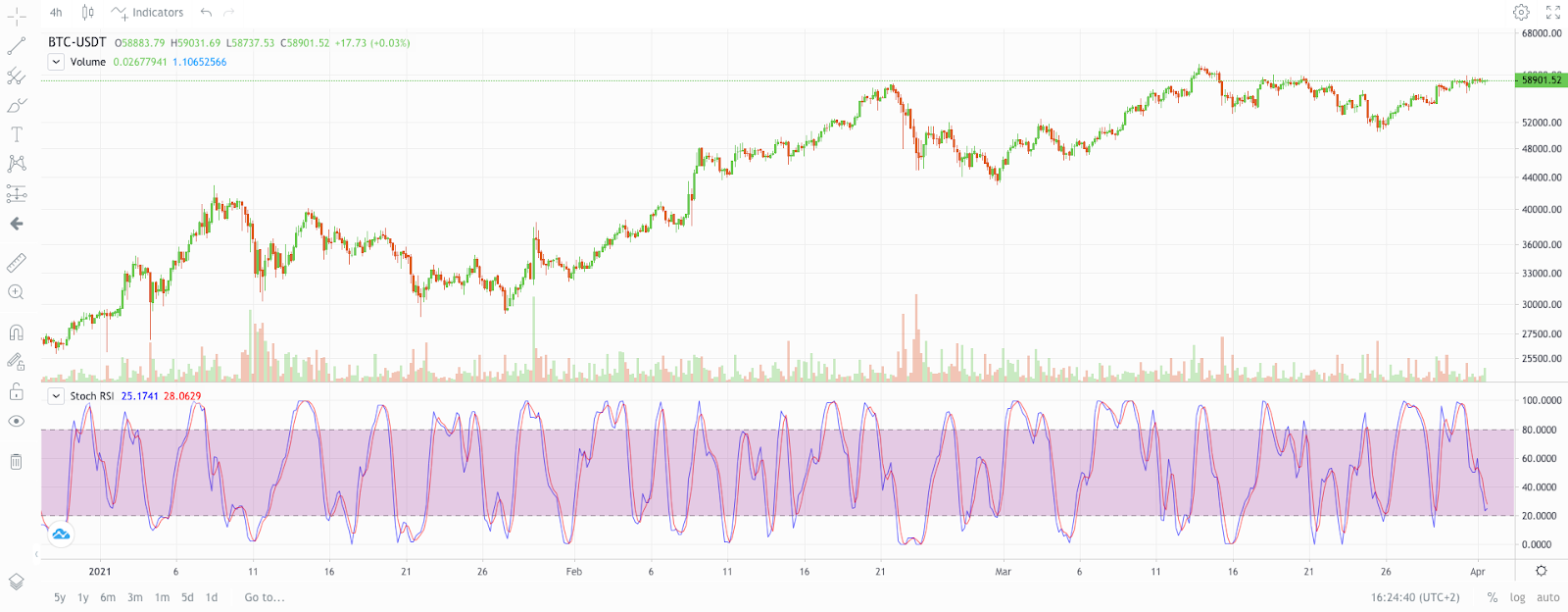 Compared to the Relative Strength Index, StochRSI moves very quickly from overbought to oversold, or vice versa, while the RSI is a much slower-moving indicator.