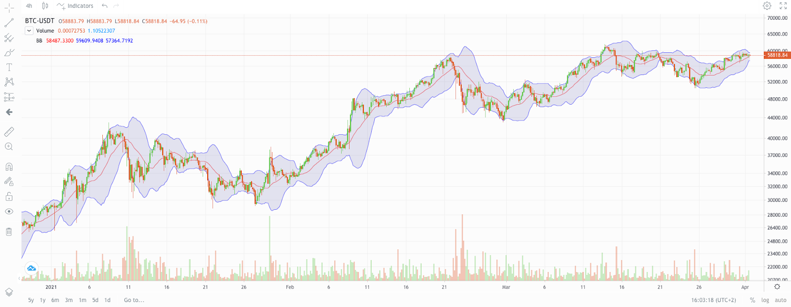 The two outer bands expand (move away from the middle line) when volatility is high. When the bands are squeezed (move closer to the middle line), the volatility is low.