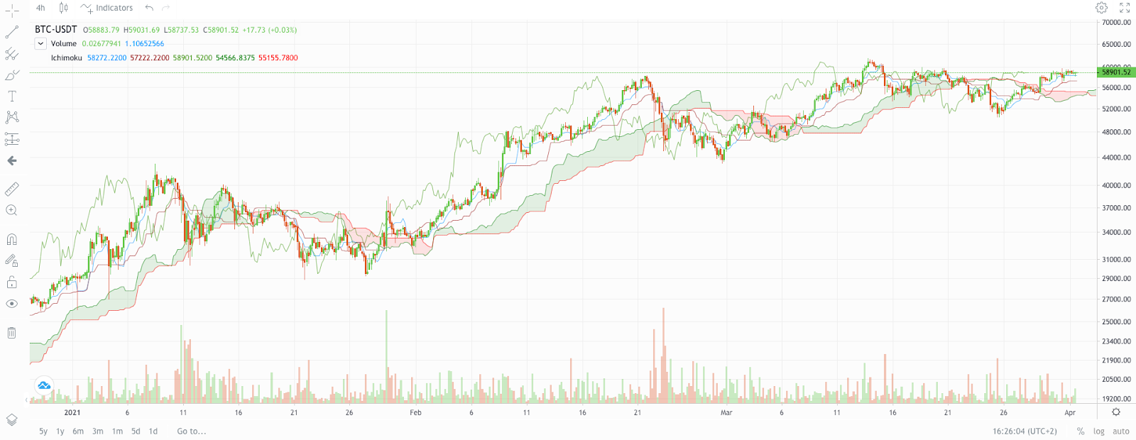 The lines clearly show support/resistance and trend direction. When two lines intersect, the area between them is shaded and forms a “cloud.” If the price is below the cloud, it means that the trend is down. If the price is above the cloud, the trend is up.