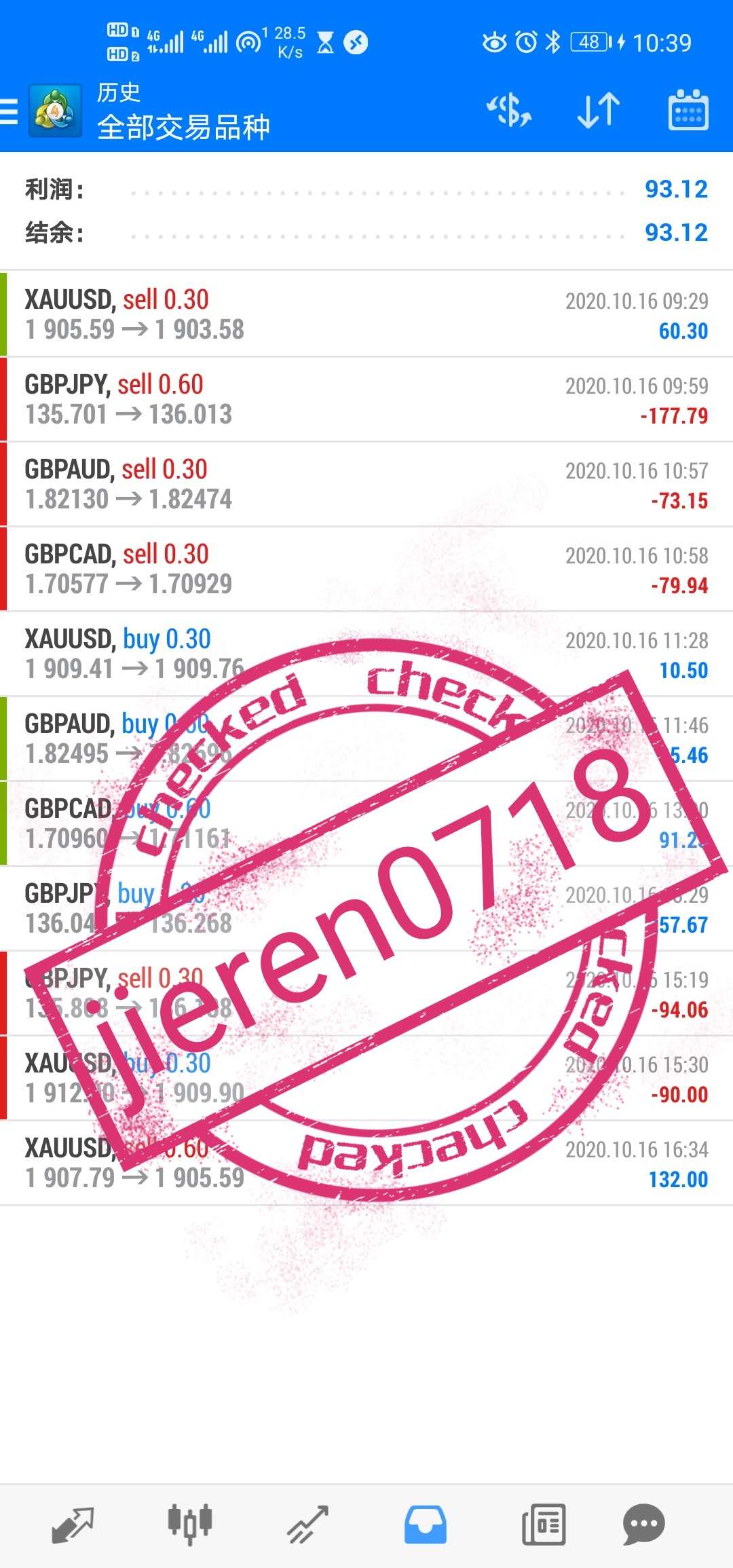 2020年10月16日交易记录jieren0718 (25)in #forex • 6 years ago 今天仍处在冬令时前期的一段时间当中,行情非常低迷。 下午2点的订单,只有黄金一次止盈,剩下的GBPJPY、GBPCAD、GBPAUD都没有止盈。 GBPJPY第二次止盈,GBPAUD第二次止盈、GBPCAD也是第二次止盈。但由于第一次都是满损,因此即使第二次止盈也没有多少利润。 下午又做了第二次XAUUSD和GBPJPY,XAUUSD在第二次止盈出来,GBPJPY在晚上快11点的时候仍然没有明显行情,因此在止损一次后终止交易。 综合上面的交易,今天获利93美金。 #mt4 #gbpjpy #xauusd #gbpaud #gbpcad