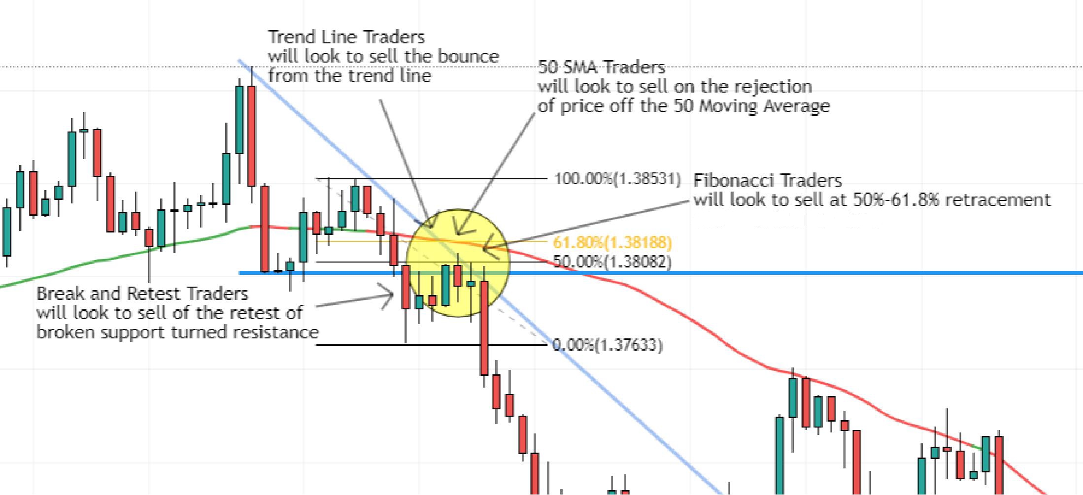 These 4 types of traders are focused on the same price at roughly the same time which makes this sell trade have a high probability of success, since so many traders would be selling here for their own reasons. Each of these traders has 3 trader confluences from the other traders supporting their trade decision. All of which pushes price down and would make an ideal place to sell. This is the market having a consensus that this is the place to sell.