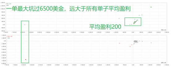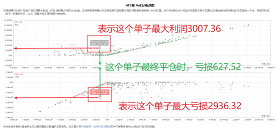 看懂图以后,就明白什么样的信号是比较好的信号,理论上MFE越大,MAE越小越好。若点越集中,说明交易者有严格的交易策略。若点比较分散,说明交易者的交易风格比较自由,此时若MAE偶尔出现较大情况,表明交易者有坑单情况,这并不是好的习惯。