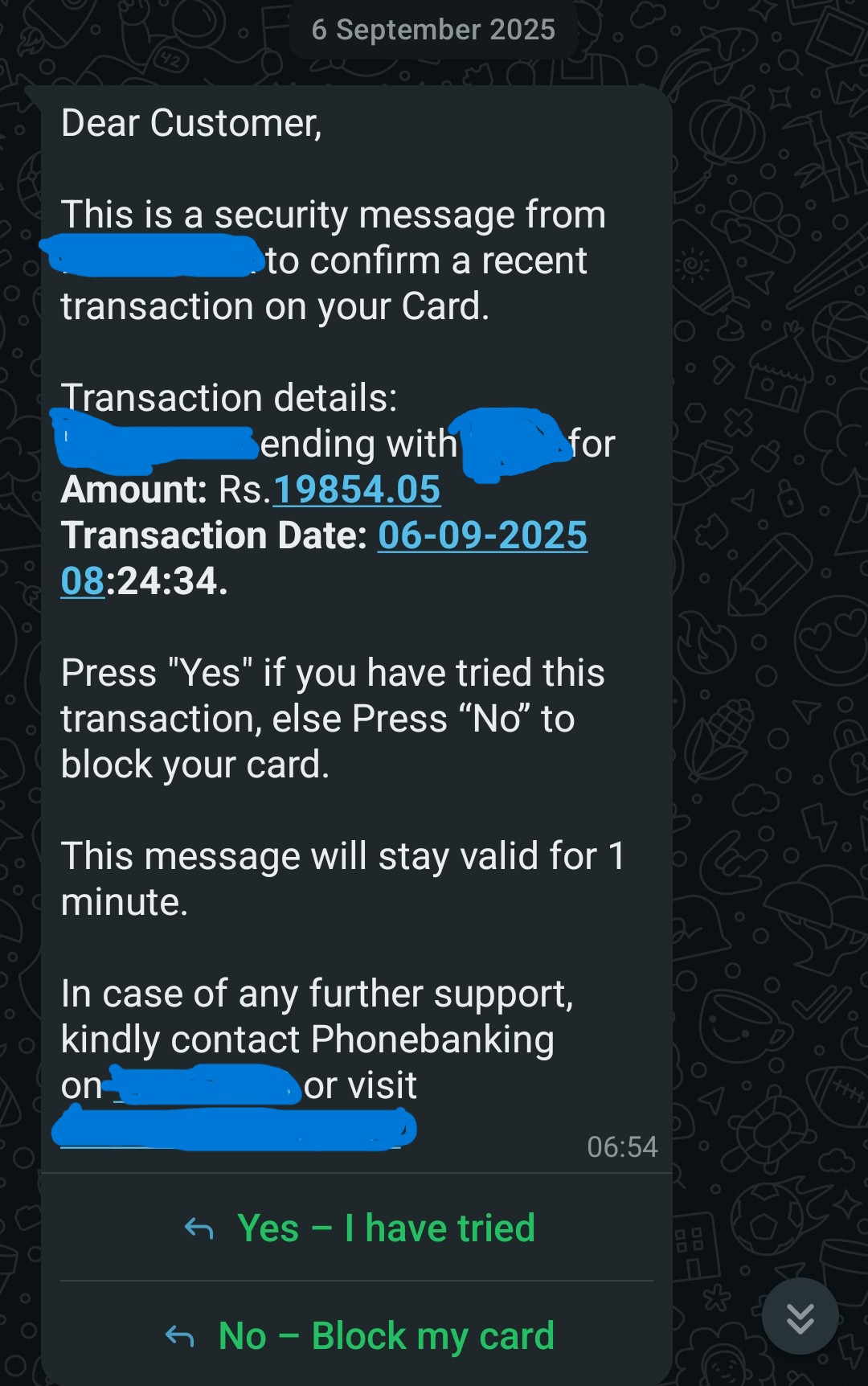 This activity was not attempted once, but twice, after the first attempt, I blocked my card temporarily so the second attempt also failed for the one who was trying to do it. It is scary for me. Normally when I use my cards there are multi layer authentications before the transaction gets approved. Like the otp that I receive on email and message. But for this transaction I did not receive any authentication messages. The bank must have detected this and hence the transaction did not get through.