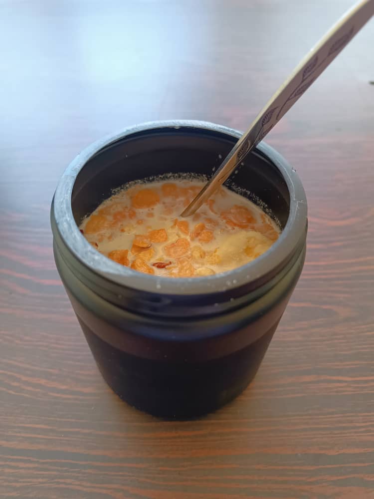 I am getting into the habit of taking this container with cereal to work, I make the milk and I take it in a 355ml soda container, the famous bombita and a cambur, here I just have to chop the cambur, pour the milk and wait about 3 minutes for the milk to soften the cereal and taste. The container in the picture looks smaller than I thought, but it is really a container of creatine that I took last year and I had saved it to use it at some point and that time came.