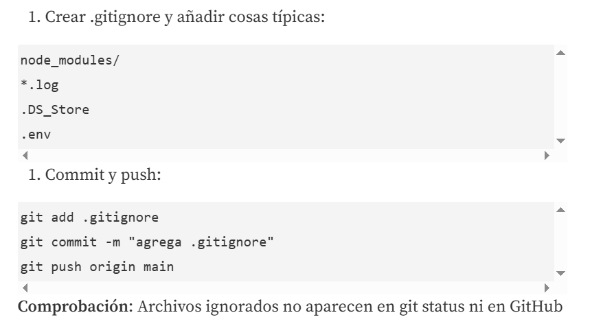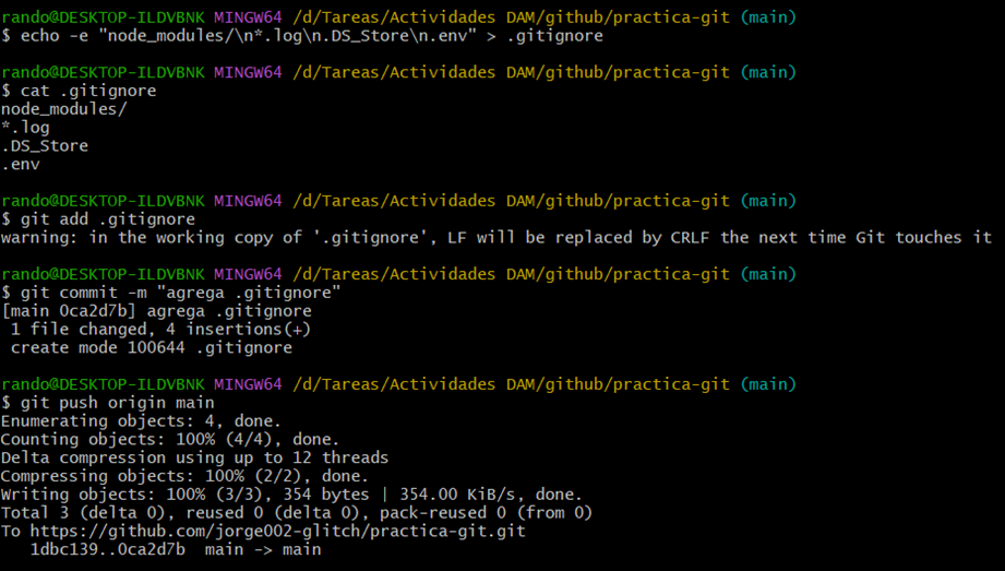 Para la sexta y ultima parte debemos crear un .gitignore y las ramas feature por lo que utilizando los siguientes comandos deberíamos de obtener lo siguiente:
