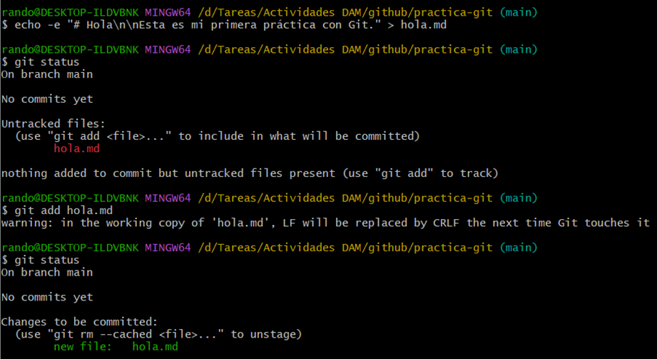 Pasamos a la tercera actividad en la cual debemos crear un archivo hola.md con el siguiente contenido: