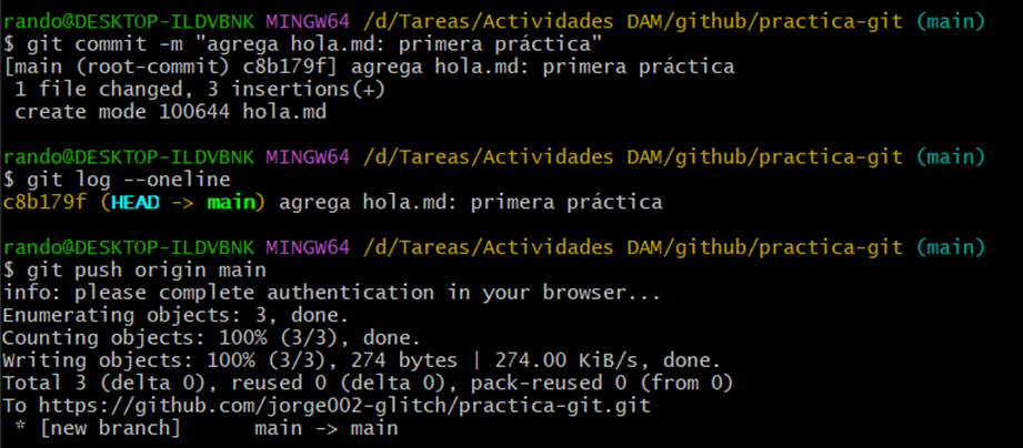 Una vez hecho eso procedemos a utilizar los siguientes comando para que se visualice en el repositorio y guardemos los cambios hechos previamente: