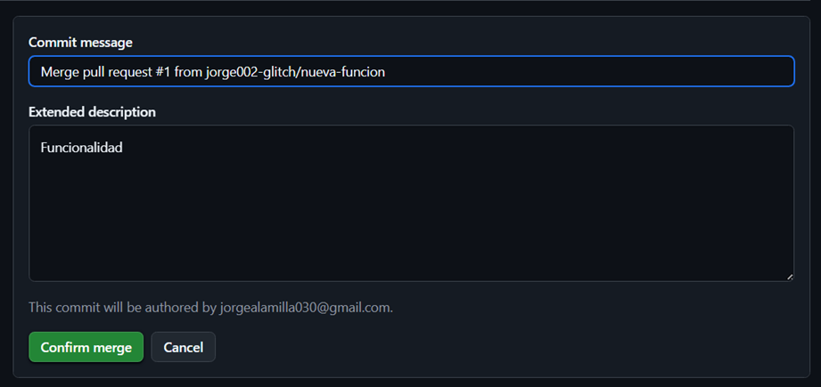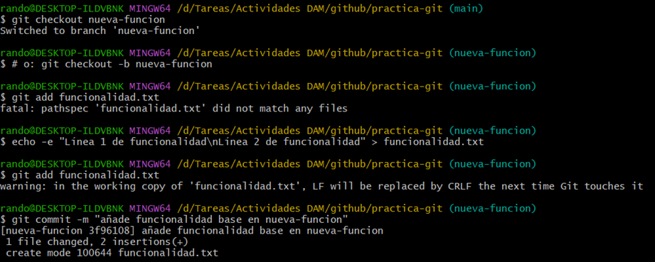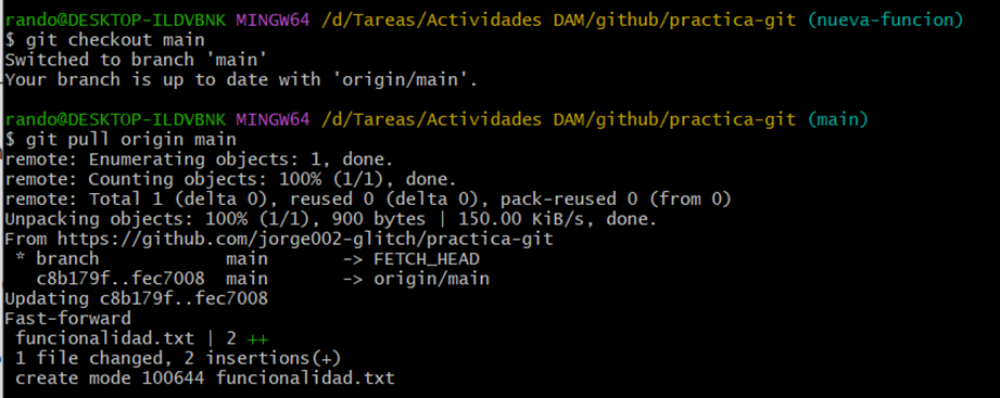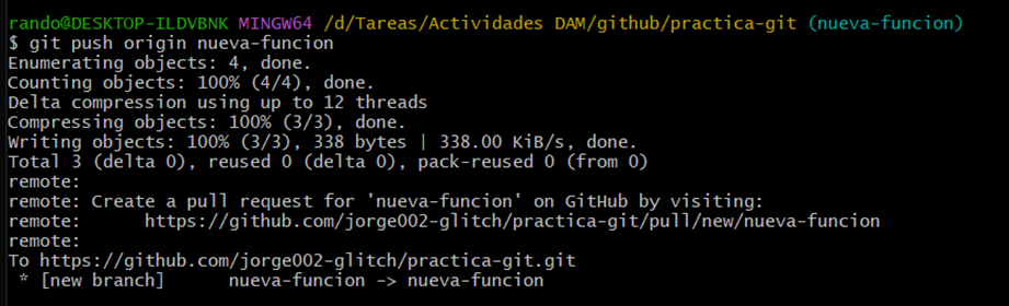 Para la parte 4 nos pide crear una rama para darle una nueva función y posteriormente fusionarla por lo que utilizamos los siguientes comandos: