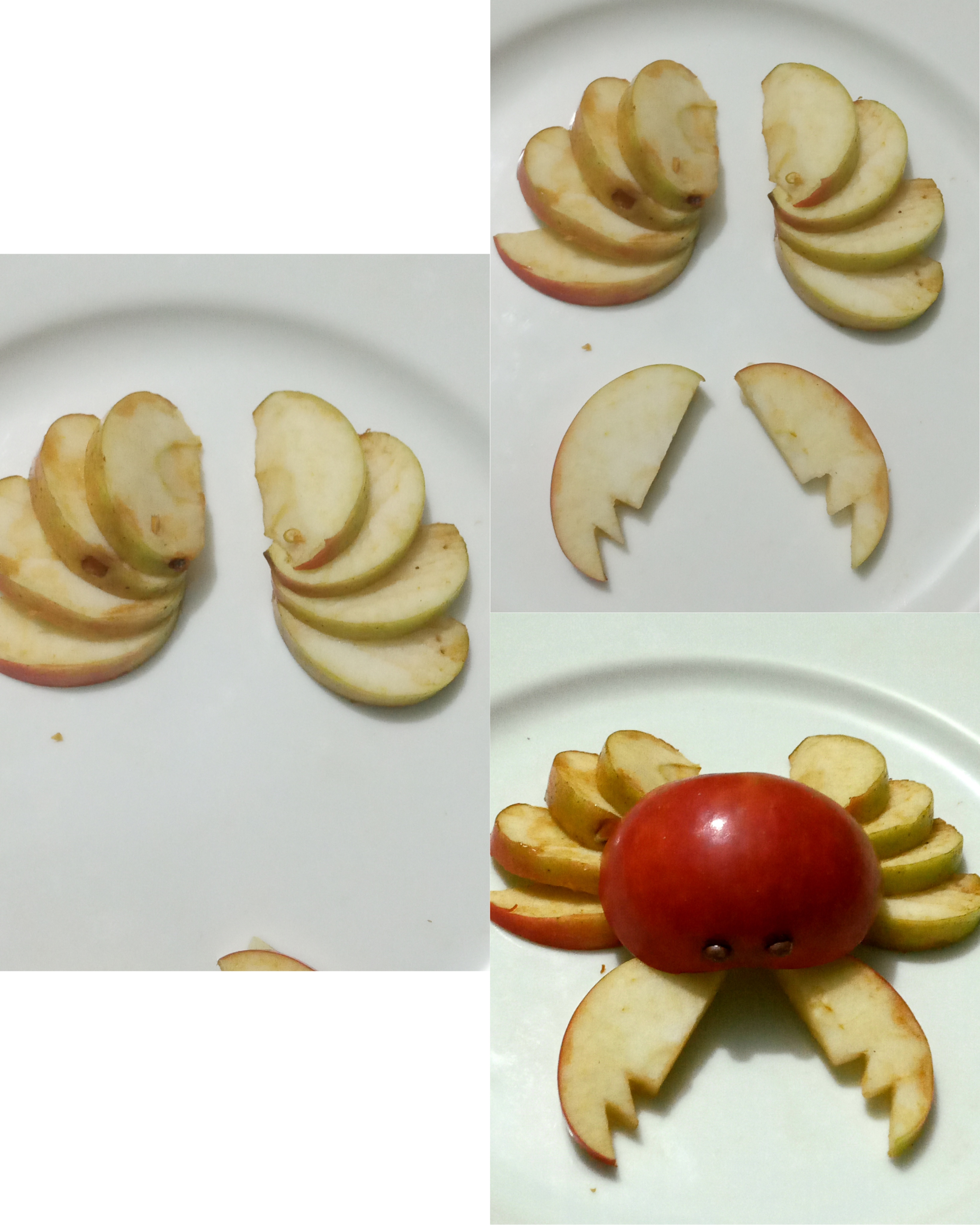 - এরপর আপেলের যে বাকি অংশটা ছিল সেটার উপরের দিকে ছুরি দিয়ে দুটো ছিদ্র করে আপেলের দুটো বিচি ঢুকিয়ে কাঁকড়ার চোখ তৈরি করে নিলাম।