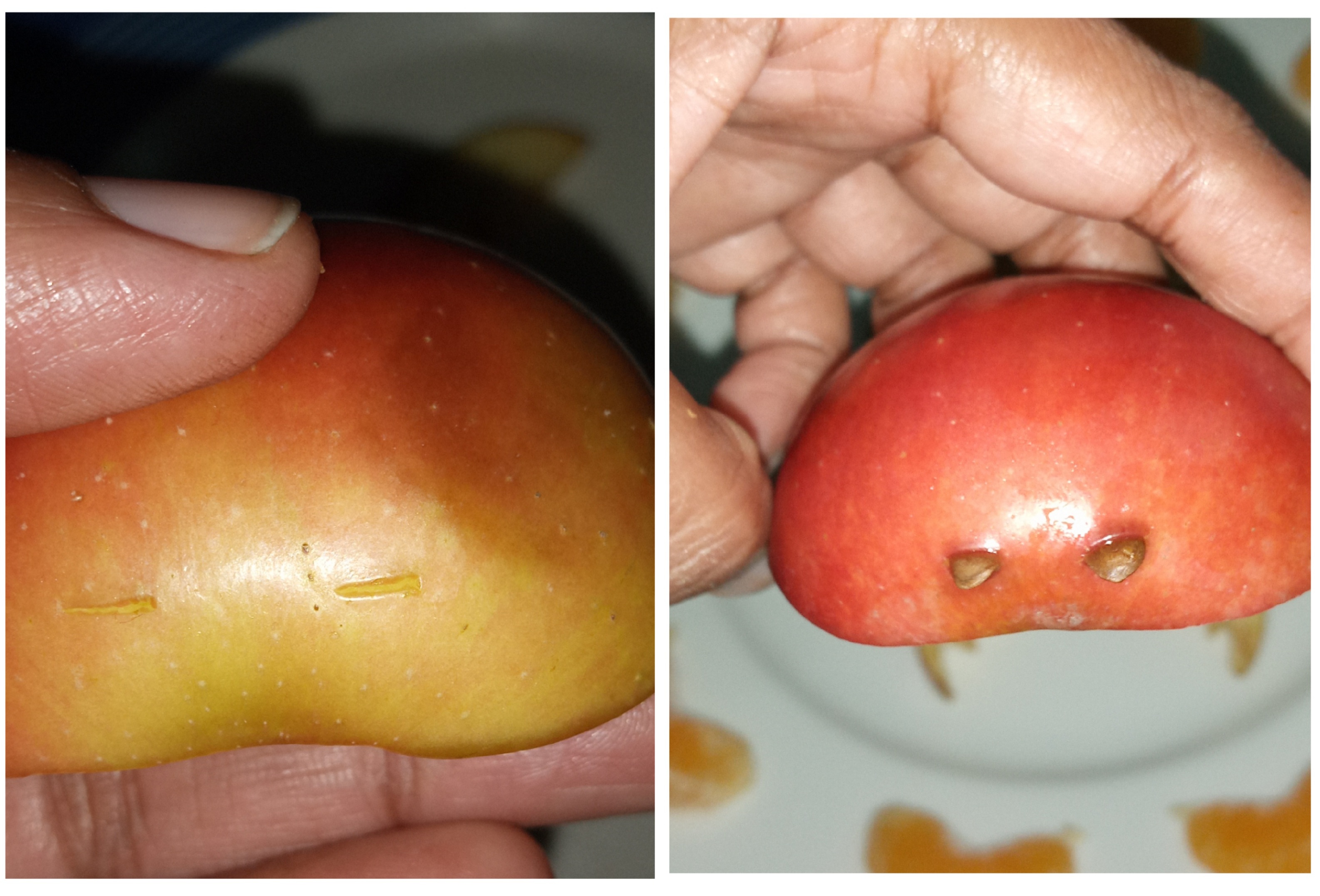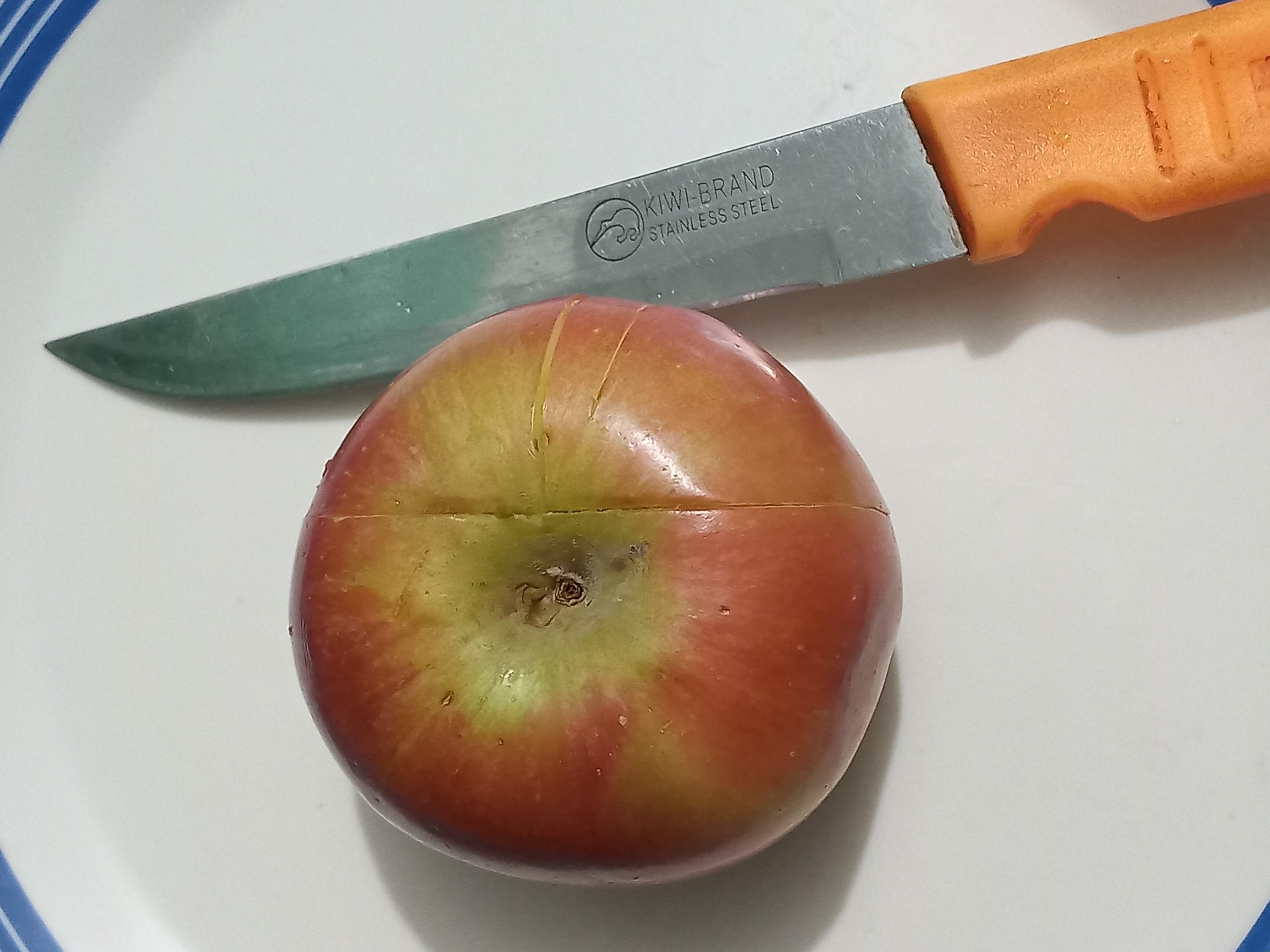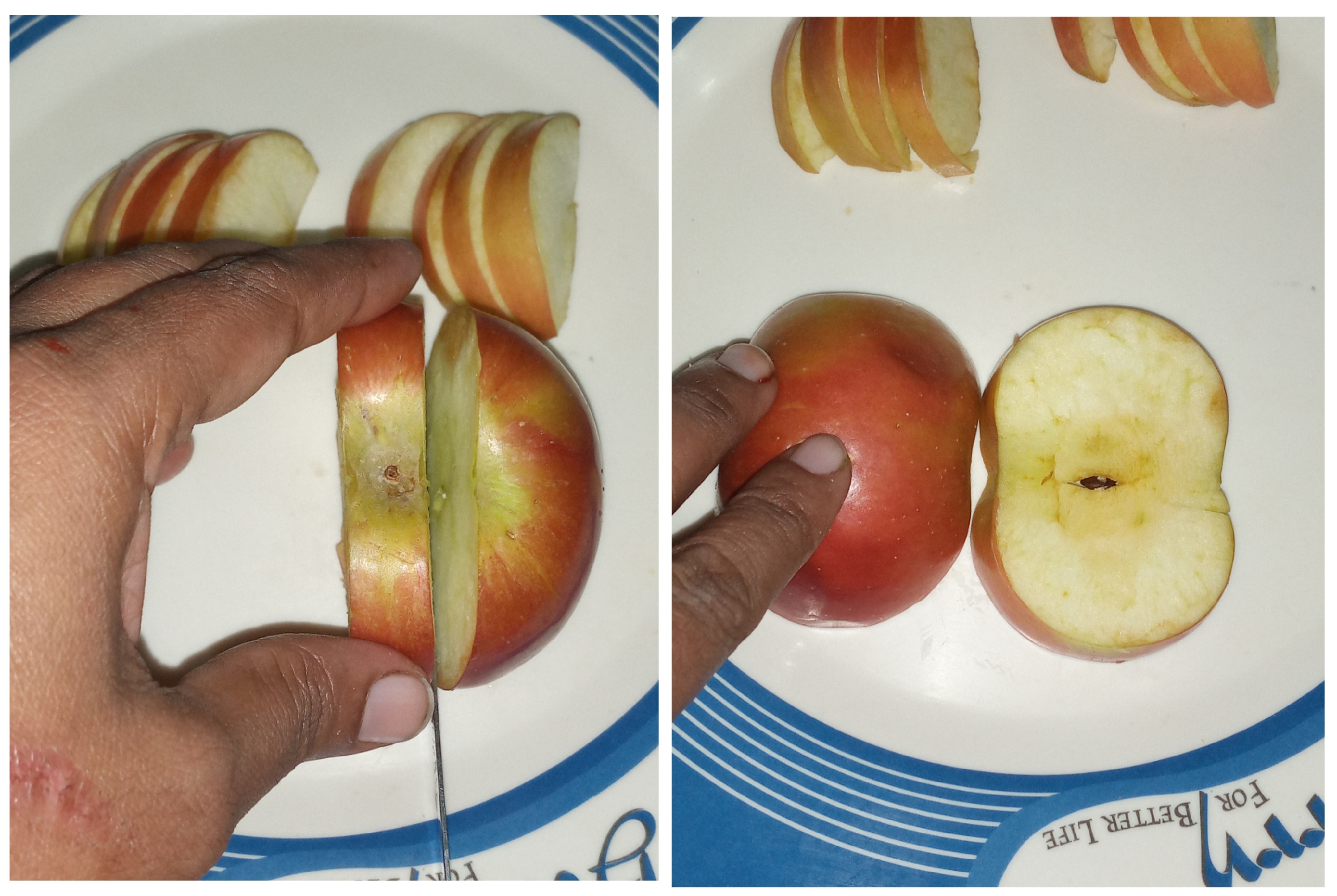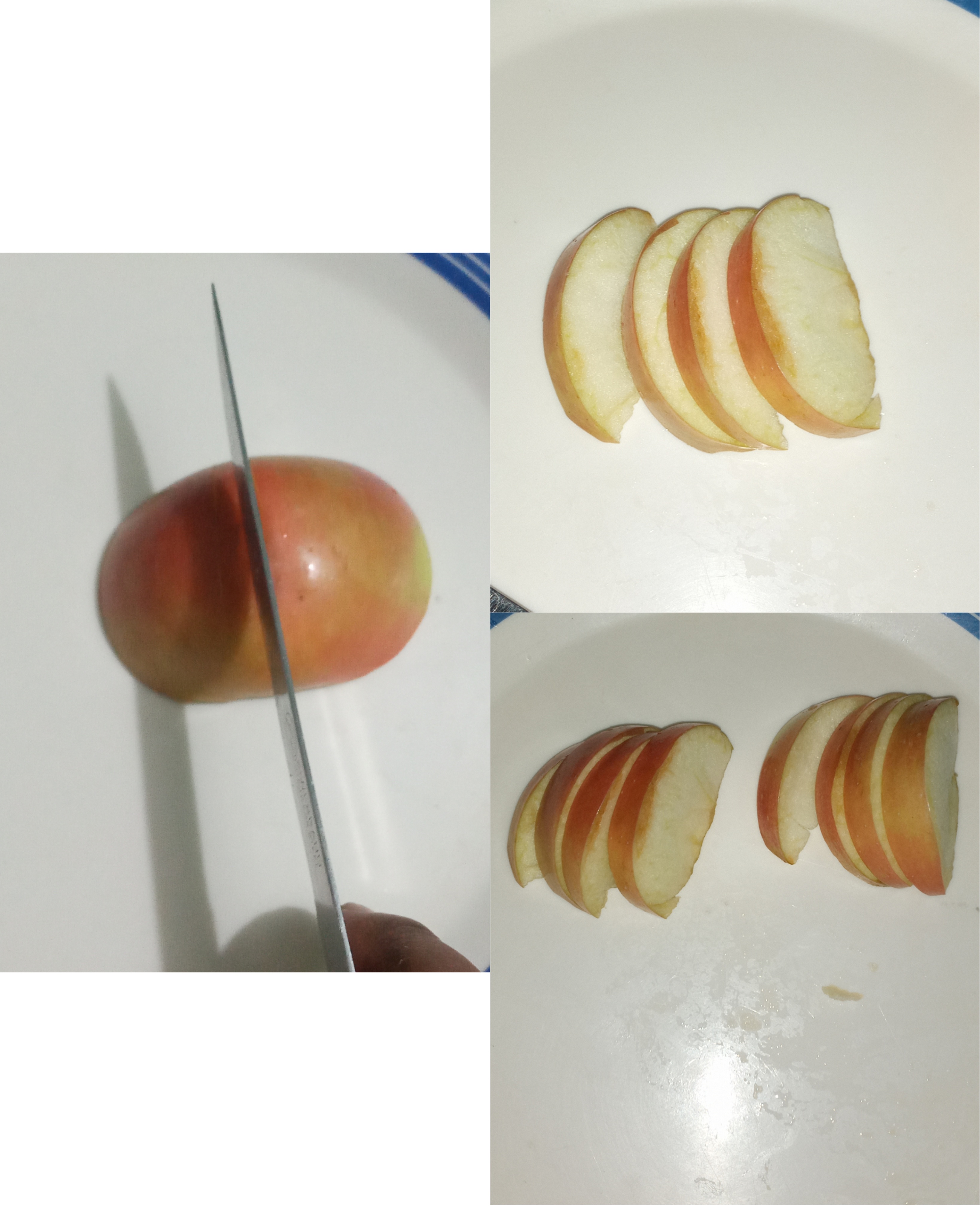 - প্রথমে আমি একটা আপেল নিলাম। তারপর একটা ধারালো ছুরি দিয়ে আপেলের একপাশ কেটে নিলাম।
