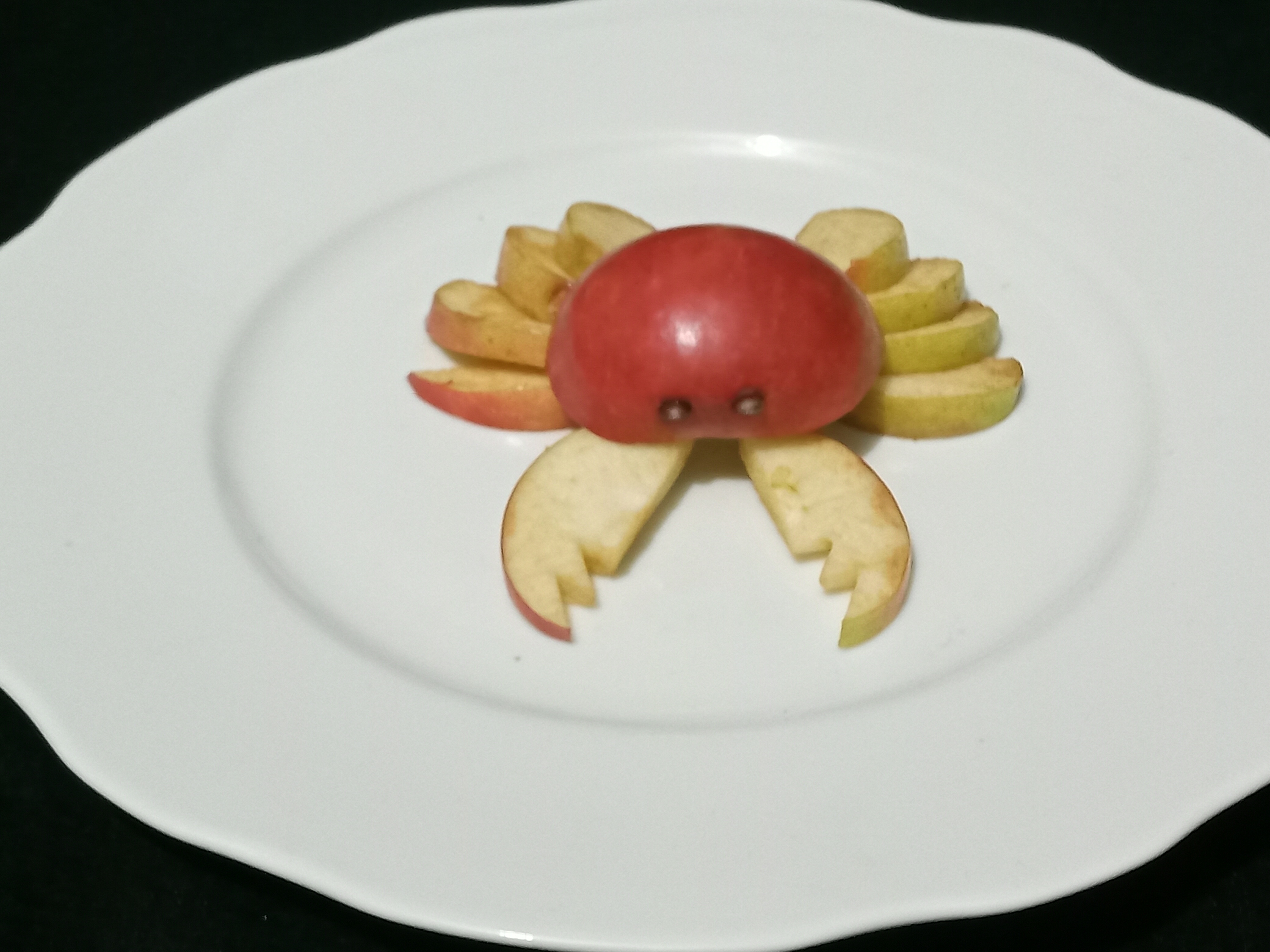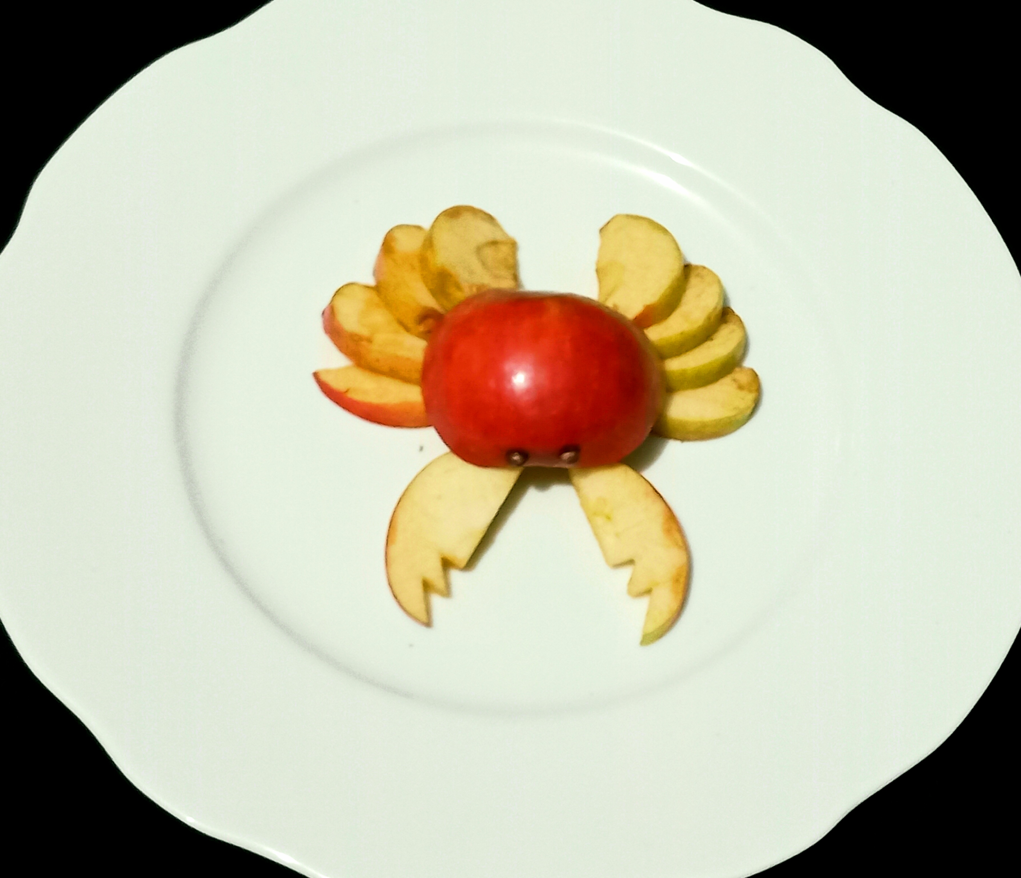 - একটি সাদা প্লেটে প্রথম যে আপেল গুলো চার টুকরো করে রেখেছিলাম সেগুলোকে সুন্দর করে সাজিয়ে রাখলাম কাঁকড়ার পা তৈরি করার জন্য। তারপর ওগুলোর সামনে দুটো ডিজাইন করা আপেলের টুকরো দিয়ে দিলাম। এরপর এগুলোর উপরে চোখ লাগানো অংশটুকু দিয়ে দিলাম। দেখুন এভাবেই তৈরি হয়ে গেল আপেল দিয়ে খুব সুন্দর একটি কাঁকড়া।