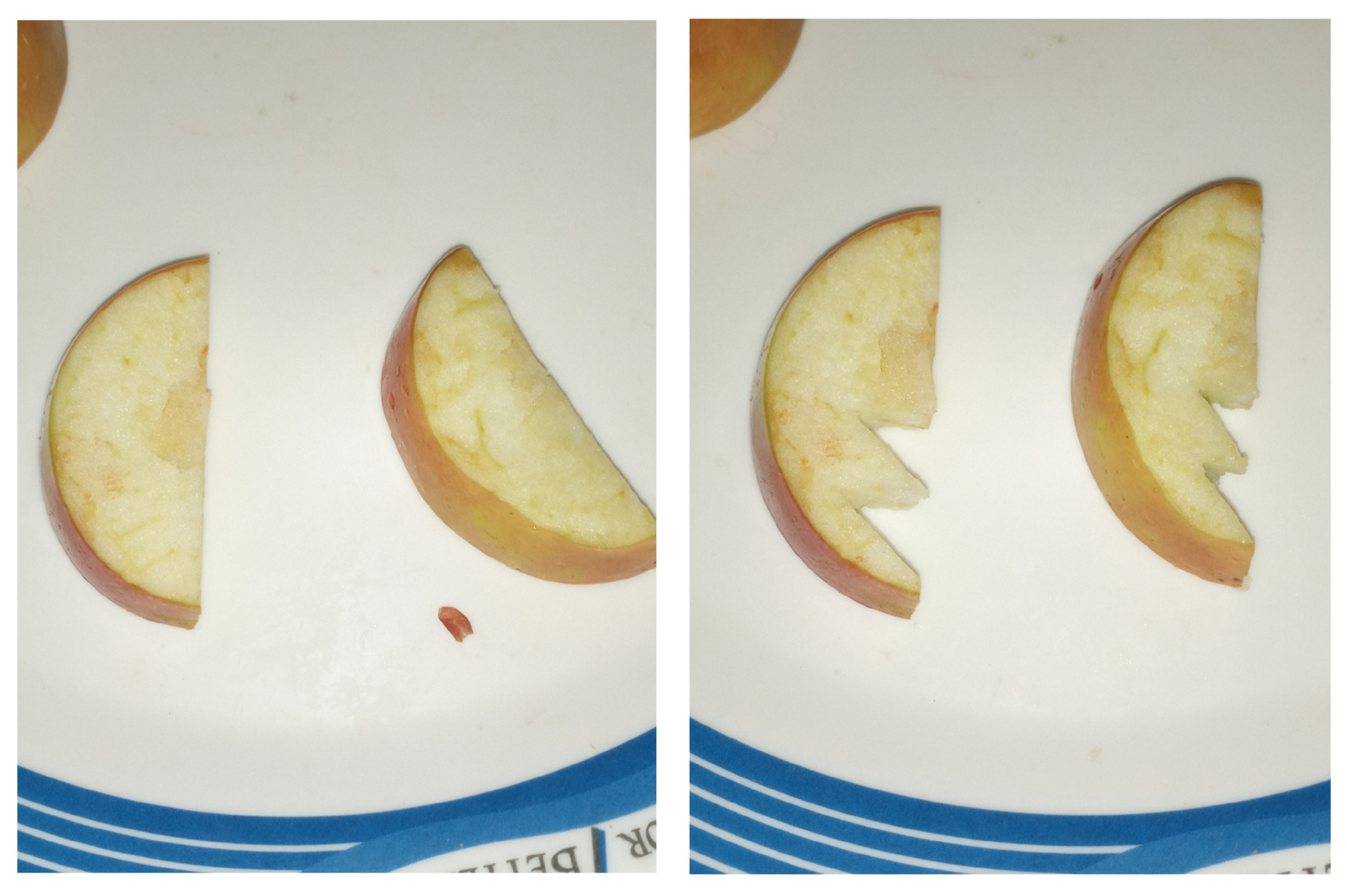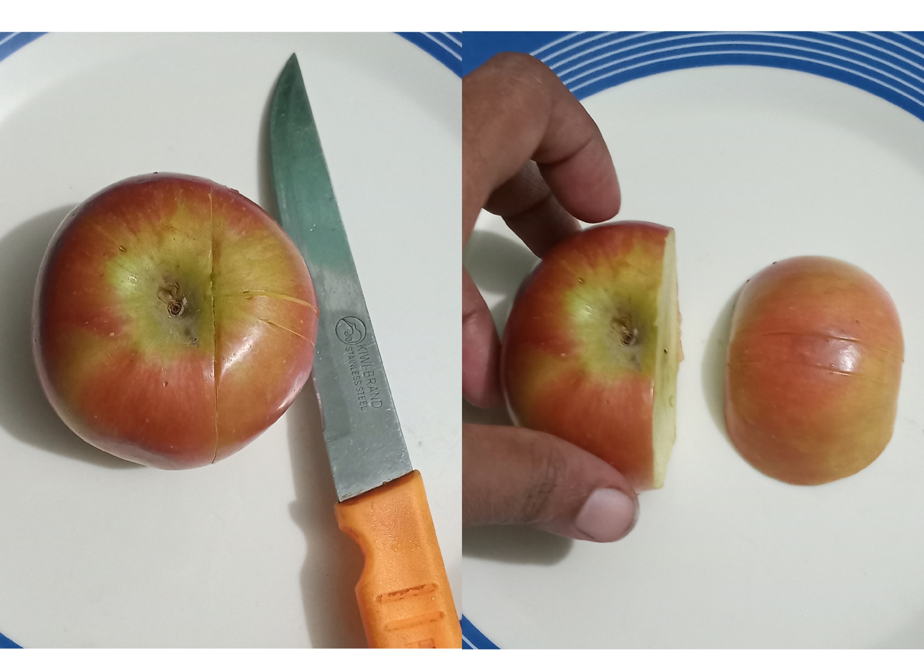 - এরপর আপেলের বাকি যে অর্ধেক অংশটা ছিল সেই অংশটাকেও দুই ভাগ করে নিলাম।