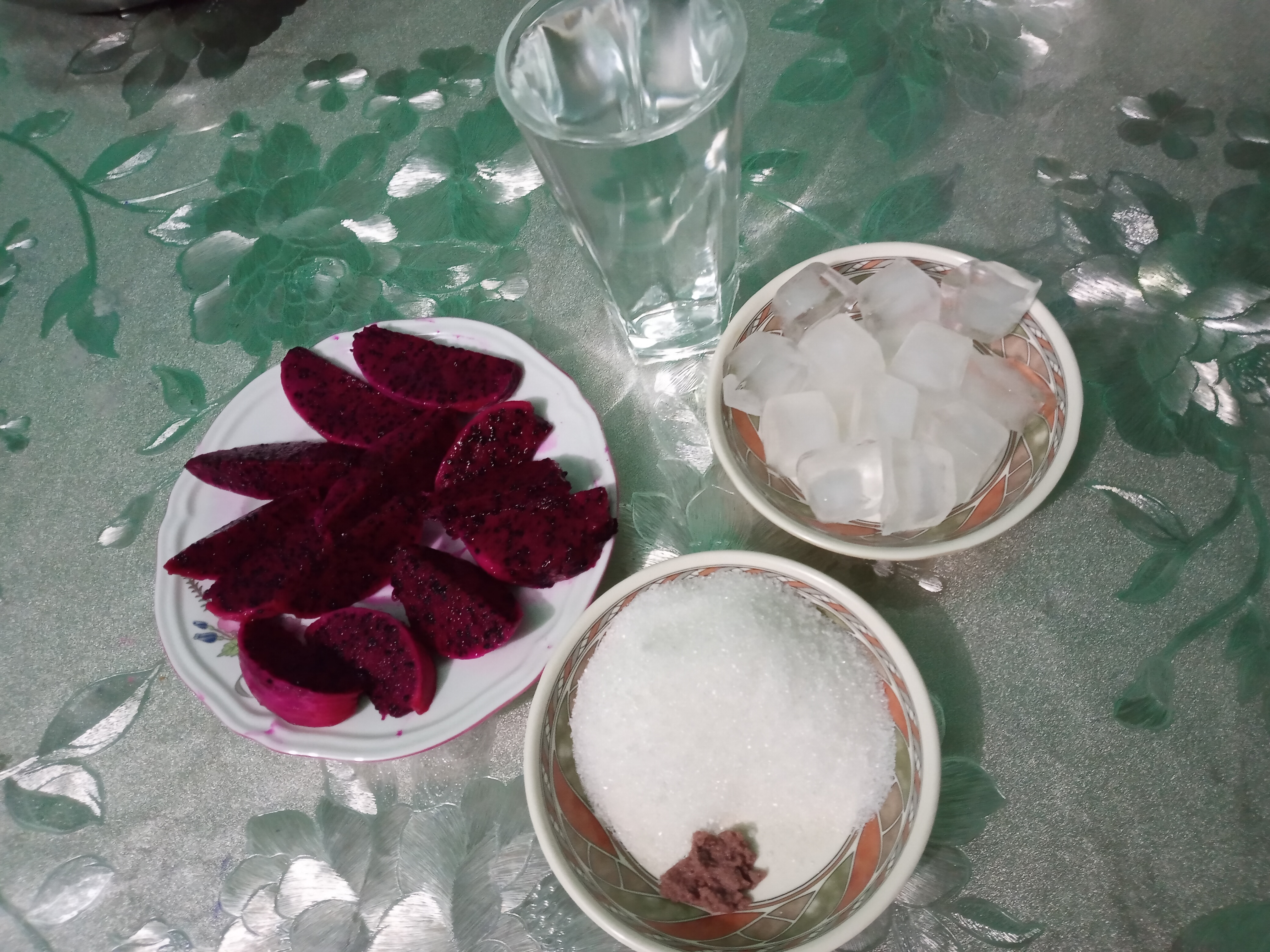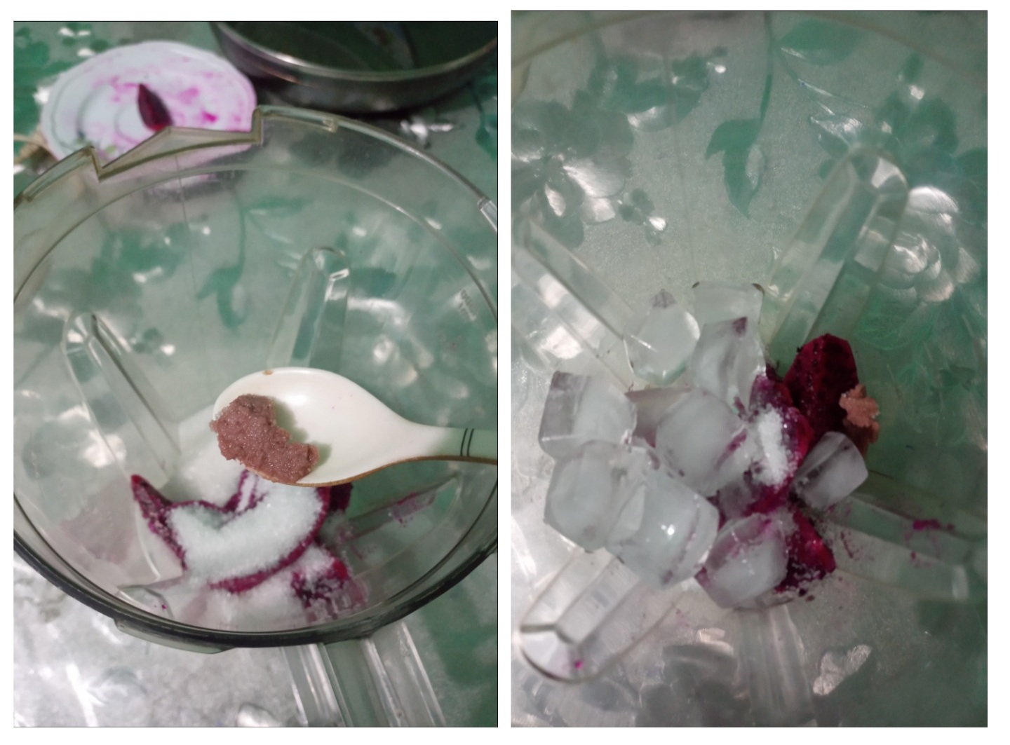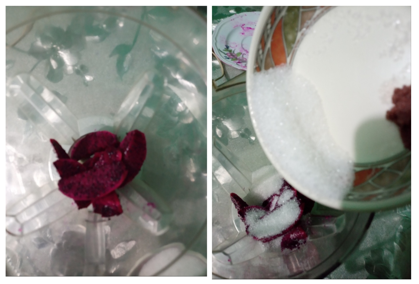• প্রথমে আমি টুকরো করে রাখা ড্রাগন ফলগুলো ব্লেন্ডারের জগে দিয়ে দিলাম। তারপর পরিমাণ মতো চিনি দিয়ে দিলাম।