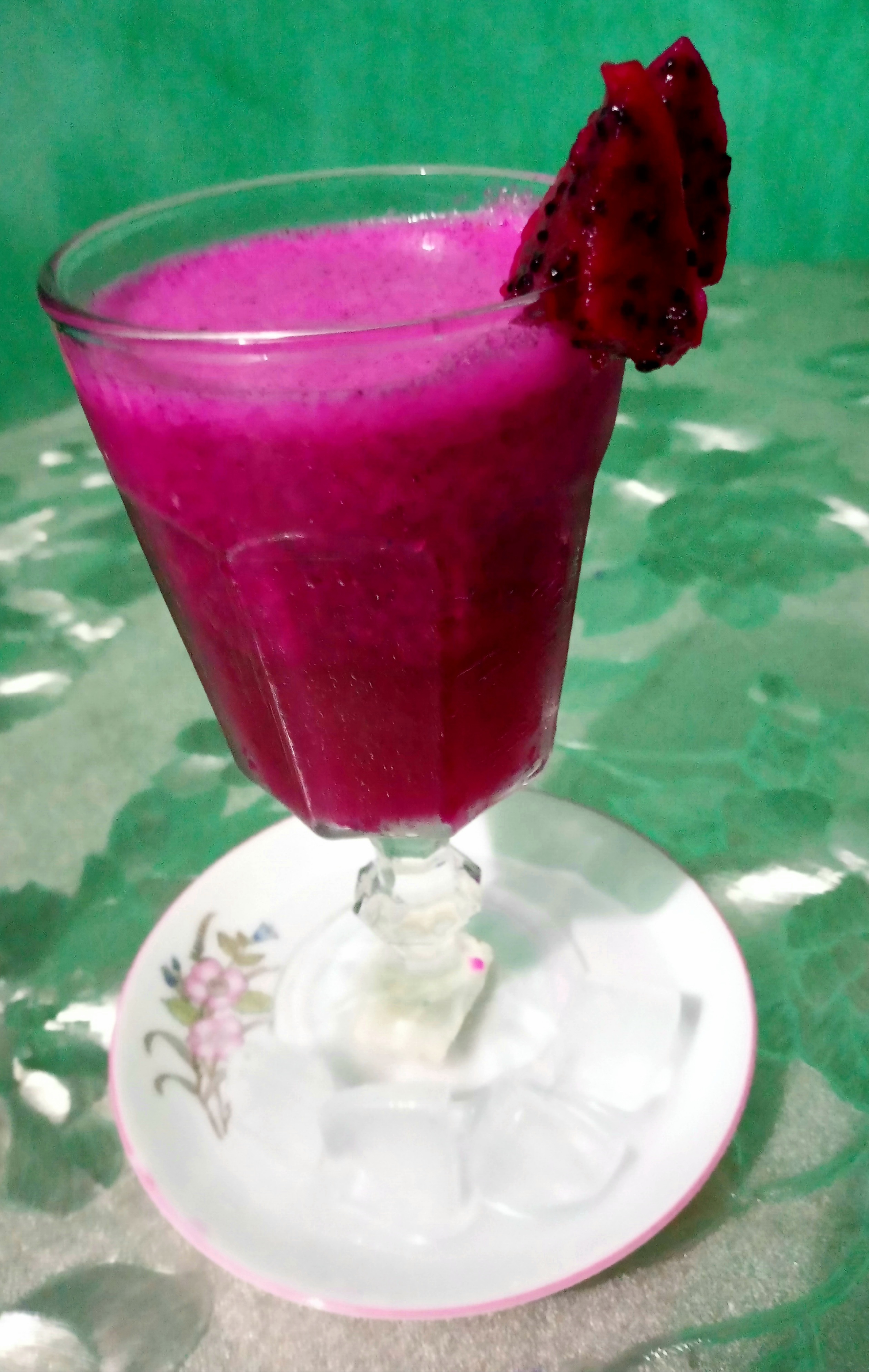 • এরপর দেখতে সুন্দর দেখার জন্য দুই টুকরো ড্রাগন ফল গ্লাসের মধ্যে দিয়ে সুন্দর করে সাজিয়ে পরিবেশন করলাম। এই জুস খেতে সত্যিই খুব অসাধারণ লাগে।