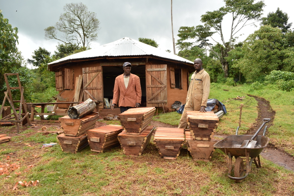 The pilot phase of the project began At Mendong Mbou community with the sawing of the Eucalyptus trees to make and installed Kenyan Top Bar Hive (KTBH). The shape of KTBH allows it to be hung conveniently off of the ground. Hung at about waist-height the hive is comfortably operated from behind without having to bend or squat. Hanging the hive off the ground also protects it from predators. .